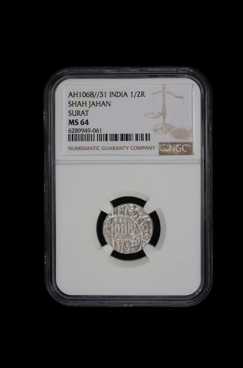 MUGHAL: Shah Jahan I, 1628-1658, AR ½ rupee, Surat, AH(1068) year 31, NGC MS64