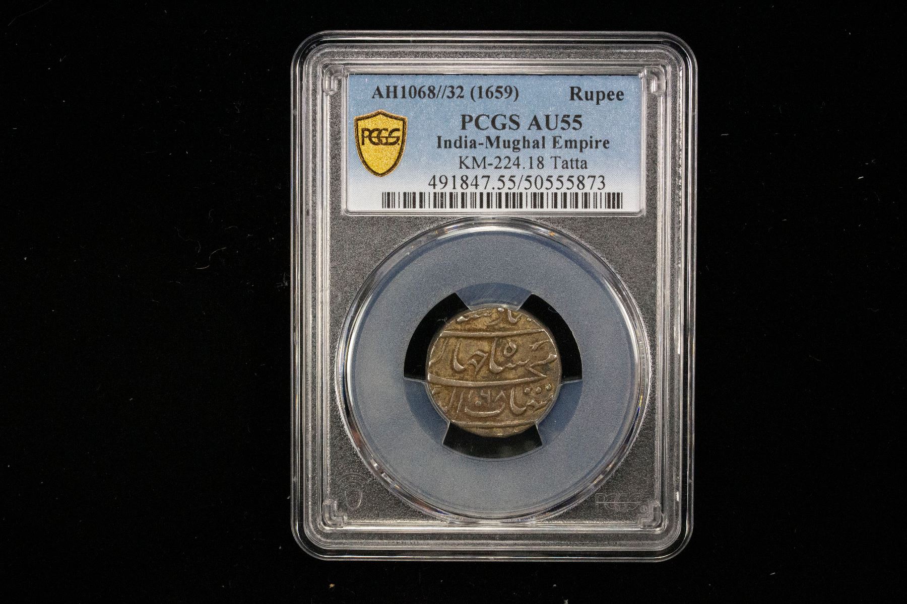 MUGHAL: Shah Jahan I, 1628-1658, AR rupee, Tatta, AH1068 year 32, Farvardin, KM-224.18, an attractive toned example, PCGS graded AU55.