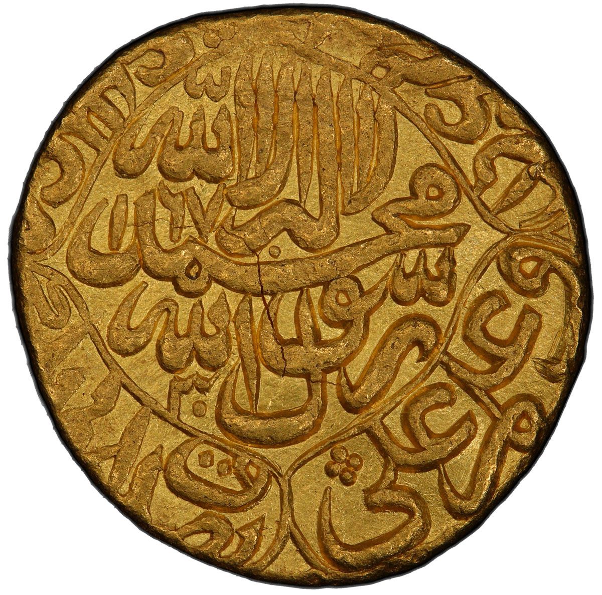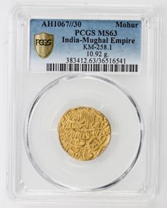 MUGHAL: Shah Jahan I, 1628-1658, AV mohur (10.92g), Daulatabad, AH1067 year 30, KM-258.3, the finest and only PCGS graded example of this date and mint, PCGS graded MS63. On the slab, the KM number is KM-258.1 (for the Ahmadabad mint), which is incorrect.