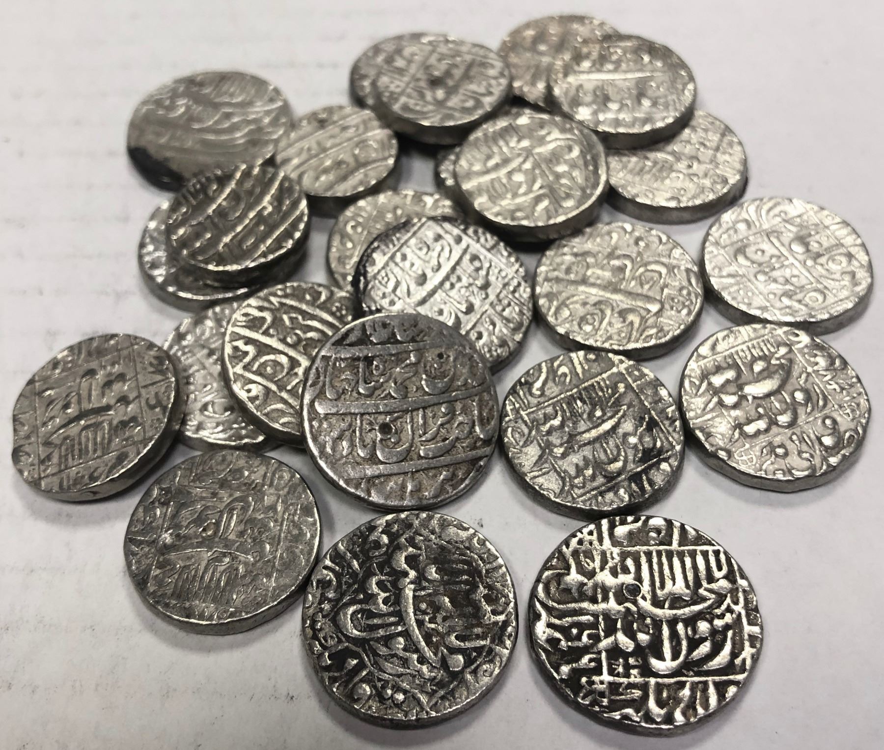MUGHAL: Shah Jahan I, 1628-1658, LOT of 24 silver rupees: Ahmadabad AH1037 year one; Akbarnagar 1046/9 and 1047/10; Burhanpur 1040 and 104x; Lahore 1044/7 (2), 1047/10, 1047/11, and 1066/29; Multan 1044/8 (2), 1045/9, 1046/10, and 1056/20; Patna 1041/4 month of Bahman and year 14; Surat 1053/—, 1054/17, year 20, and 1066/30 (2); and Tatta 1052/16 and 1057/21; average Fine to VF, some with testmarks or light adhesions; retail value $550, lot of 24 pieces.