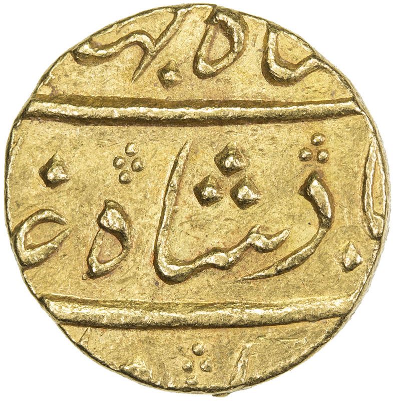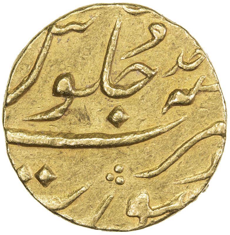 MUGHAL: Shah Jahan III, 1759-1760, AV mohur (11.12g), Surat, year one (ahad), KM-478.6, EF, ex Ajit Singh Collection.