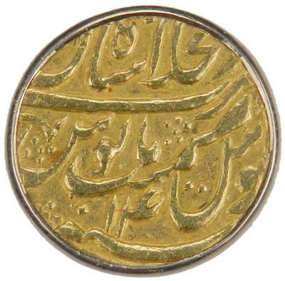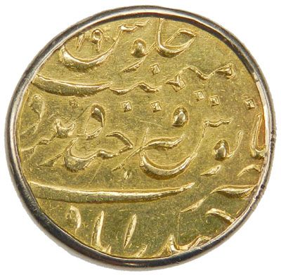 MUGHAL:pair of gold coins set in 14K custom made cufflinks, which inlcudes a Mughal AV mohur of Muhammad Shah, Shahjahanabad mint, year 14 in xf condition, and a Hyderabad AV ashrafi of Mir Mahbub Ali Khan II, year 19 in au condition, both Hijri dates partly obsured by cufflink, a lovely set to wear in any formal situation!