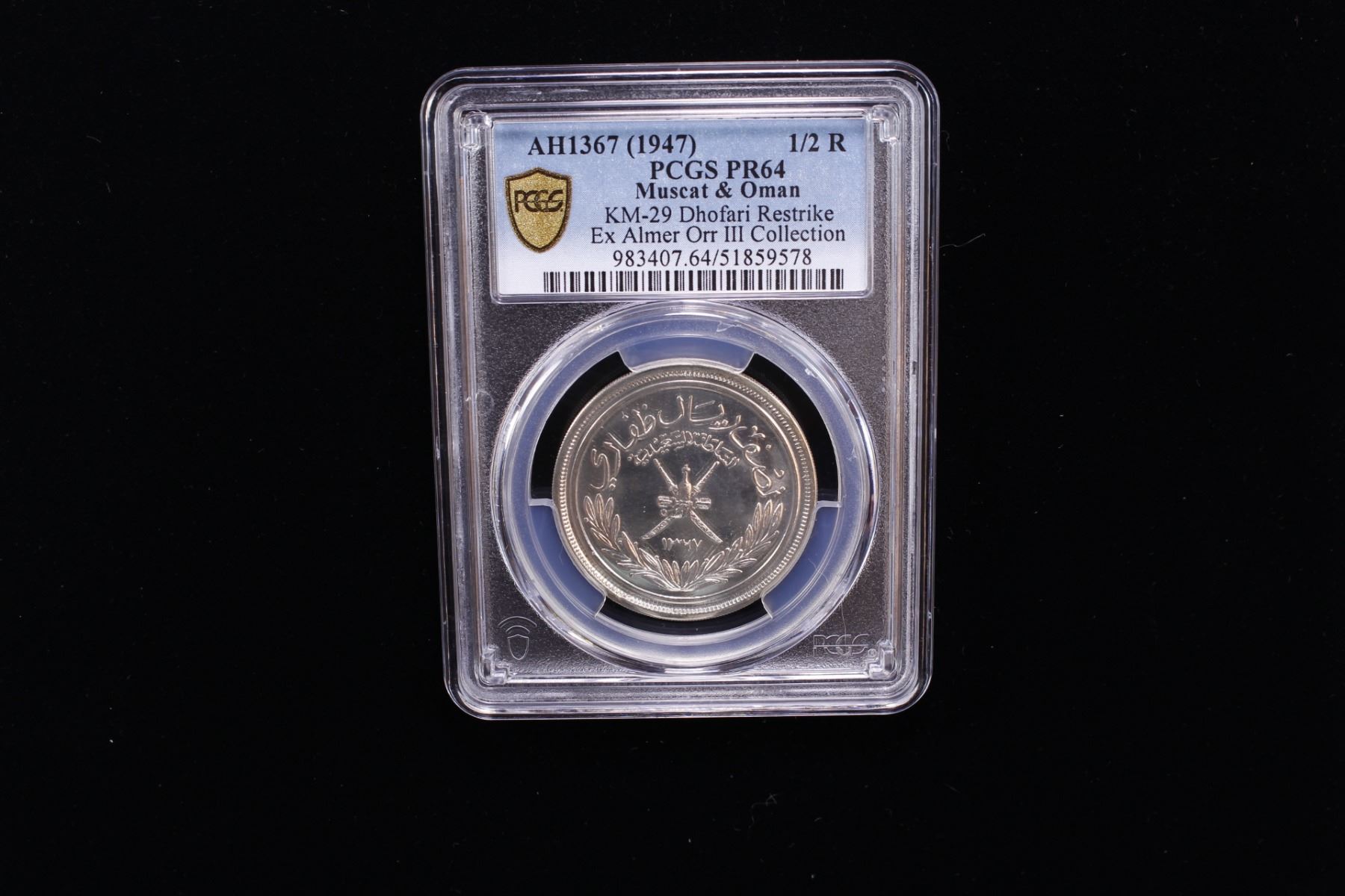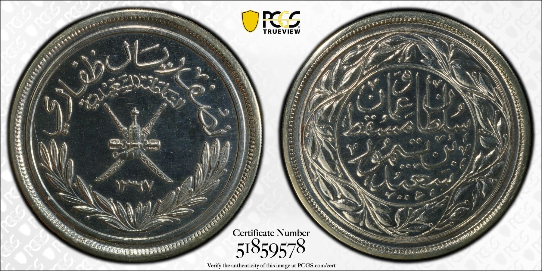 MUSCAT & OMAN: Sa'id ibn Taimur, 1932-1970, AR ½ dhofari rial, AH1367, KM-29, Y-11, Dhofari restrike, a wonderful example, PCGS graded Proof 64, ex Almer H. Orr III Collection.