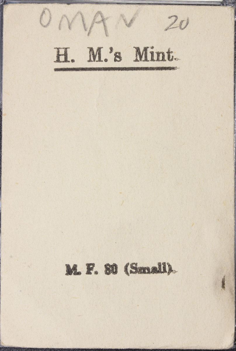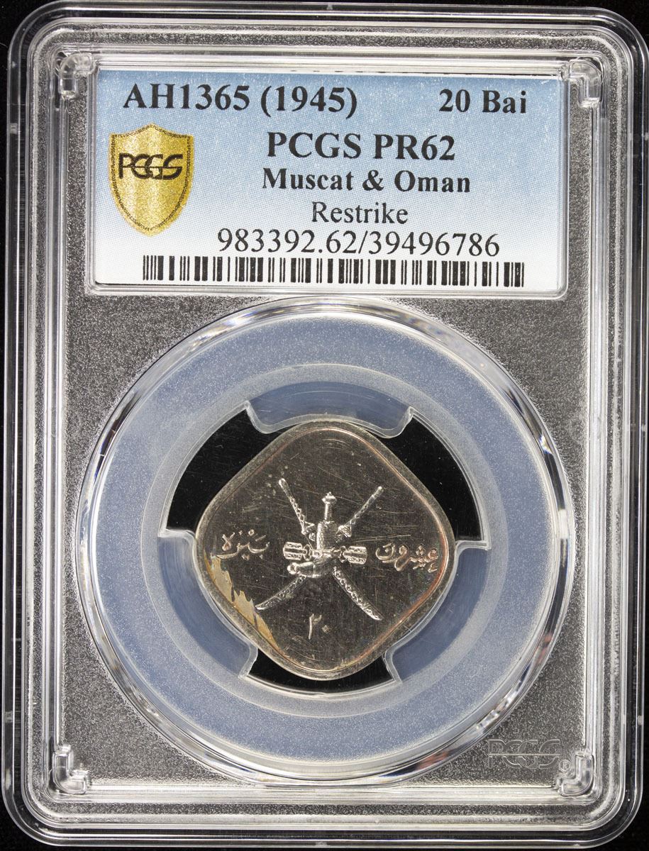 MUSCAT & OMAN: Sa 'ud b. Taimur, 1932-1970, 20 baiza, AH1365, KM-27, Bombay mint proof restrike, with original mint envelope labeled H.M. 's Mint (His Majesty 's Mint), PCGS graded Proof 62.
