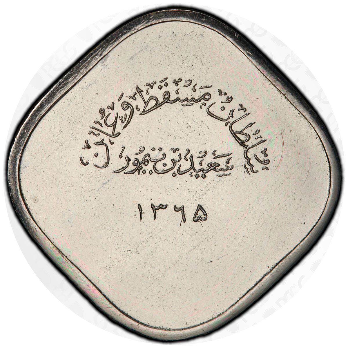 MUSCAT & OMAN: Sa 'ud b. Taimur, 1932-1970, 20 baiza, AH1365, KM-27, Bombay mint proof restrike, with original mint envelope labeled H.M. 's Mint (His Majesty 's Mint), PCGS graded Proof 64.