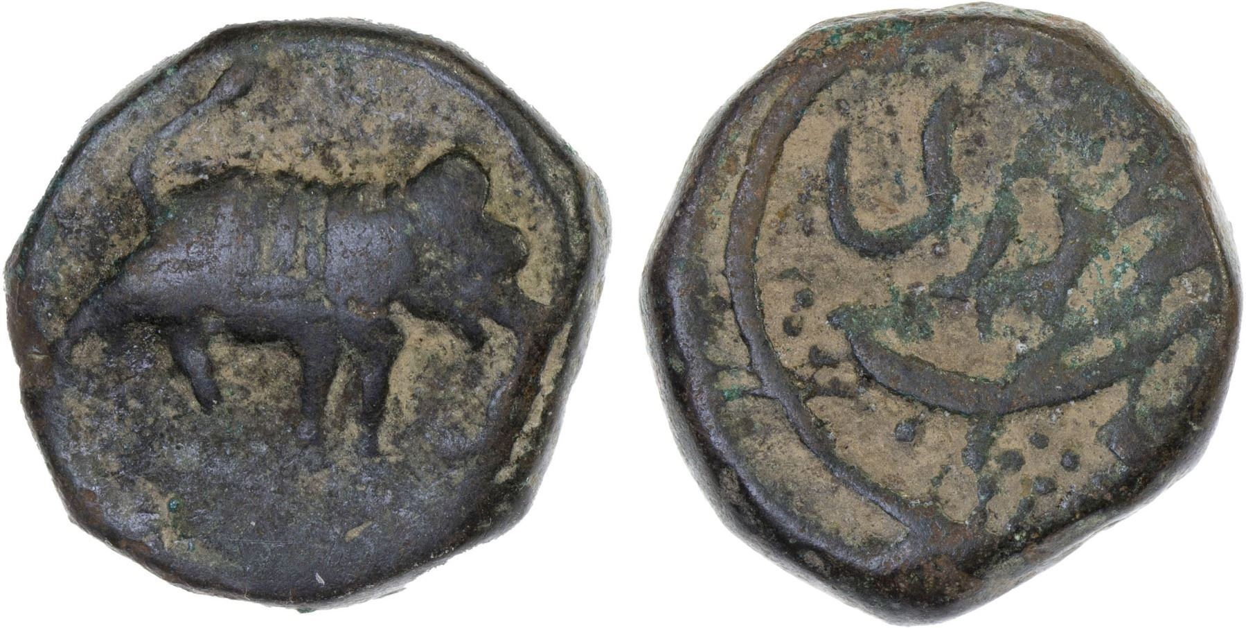 MYSORE: Haidar Ali, 1761-1782, AE paisa (13.06g), Balhari, ND, KM-2, elephant right, rare mint, Fine, ex Dr. Vincent John Adams Flynn Collection.