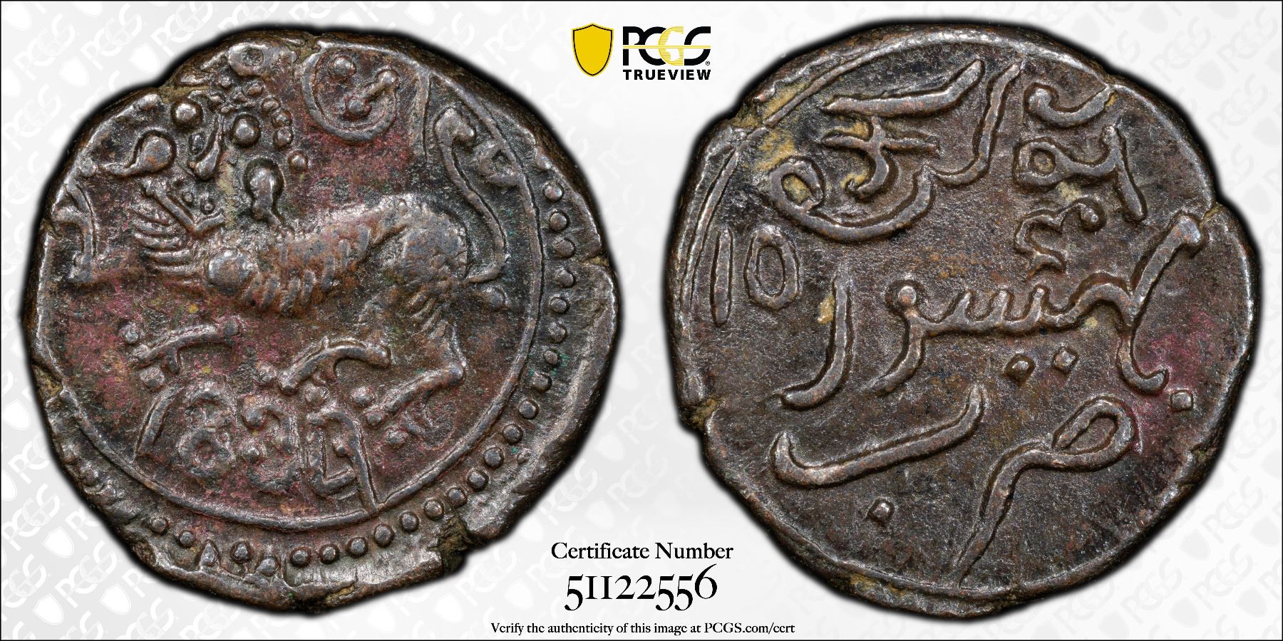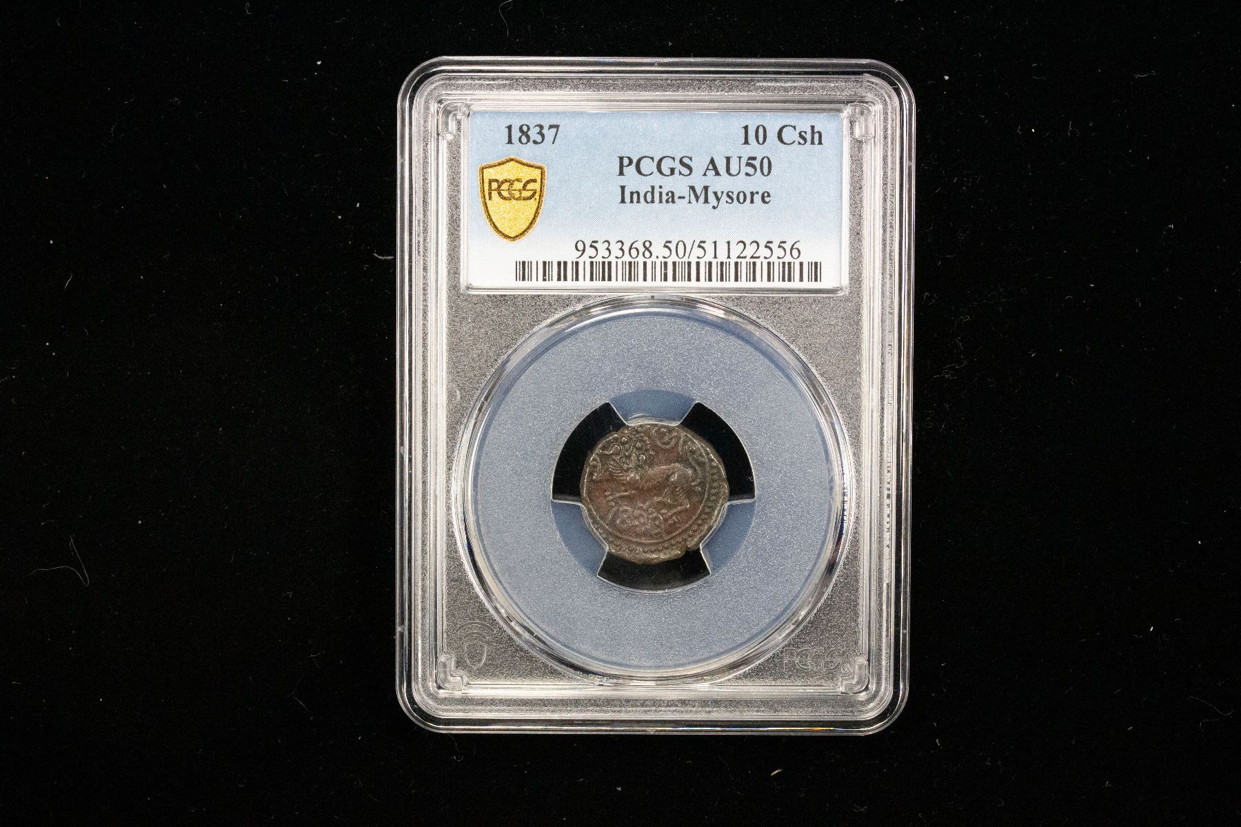 MYSORE: Krishna Raja Wodeyar, 1799-1868, AE 20 cash, 1837/5, Cr-192.2, struck at the Bangalore subsidiary mint facility, scarce overdate, PCGS graded AU50.