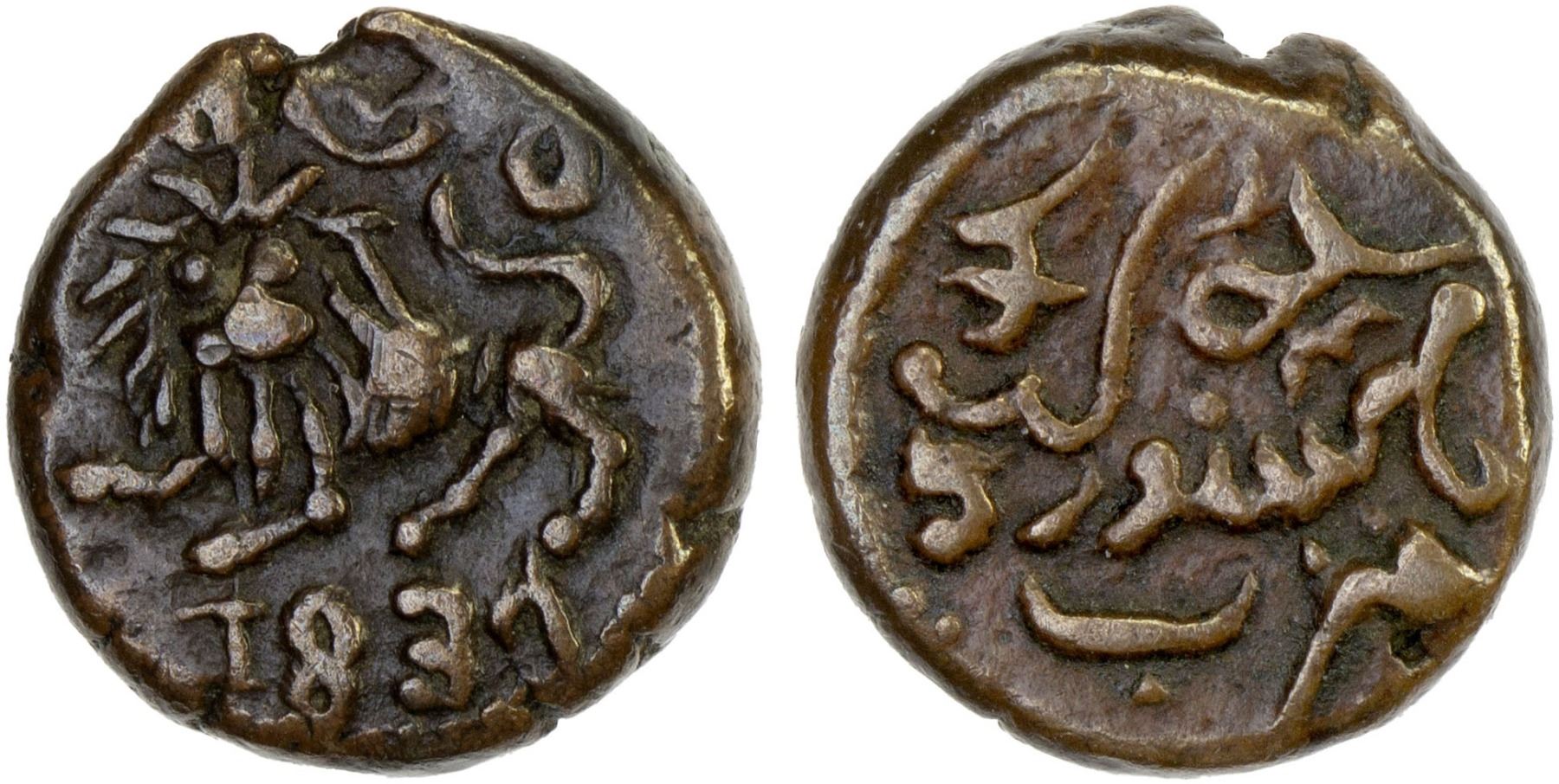 MYSORE: Krishna Raja Wodeyar, 1799-1868, AE 5 cash (2.28g), Mysore, 1837, KM-191.2, lion left, bold strike without any weakness, VF-XF.
