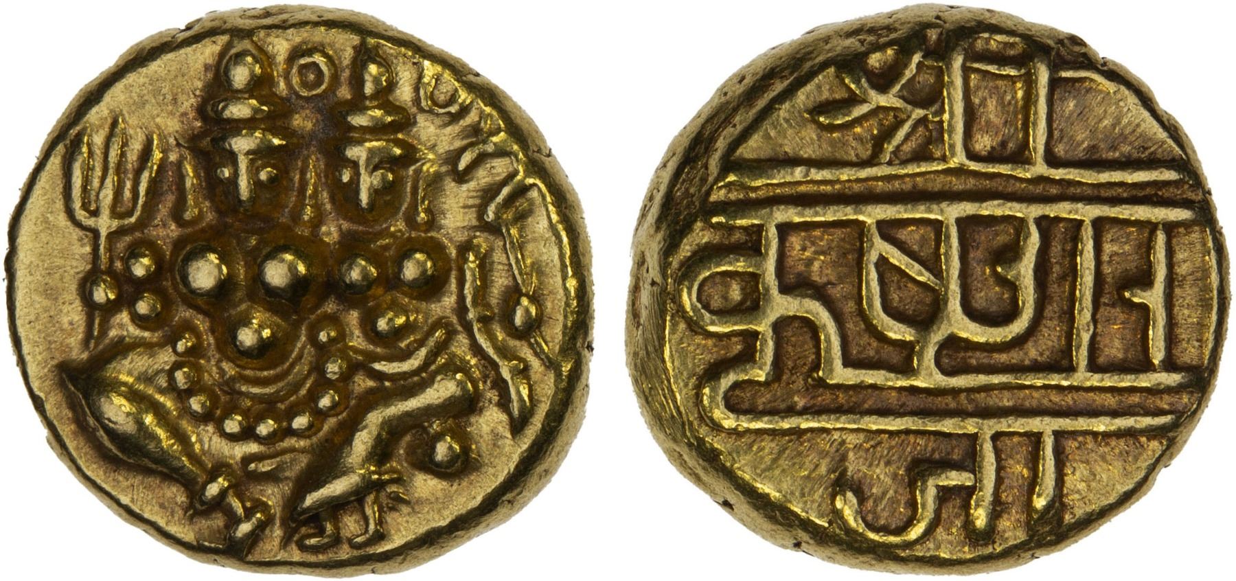 MYSORE: Krishna Raja Wodeyar, 1799-1868, AV pagoda (3.40g), KM-210, Fr-1358, Zeno-255191, Siva & Parvati, holding trident & damaru // Nagari sri krishna raja; struck 1799 until about 1831, early style, VF-XF.
