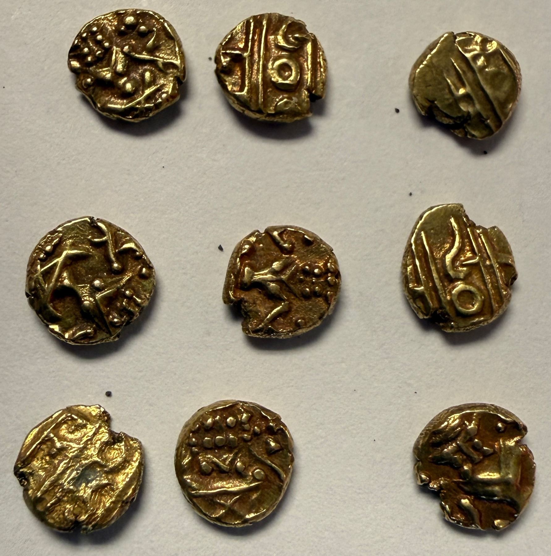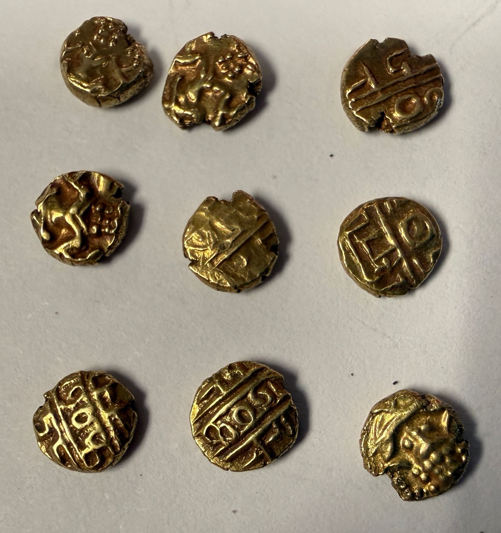 MYSORE: LOT of 9 AV fanams, all from the reign of Kanthirava Narasaraja Wodeyar I, with seated Vishnu on one side and sri kamth rava in Devanagari on the other; all between 0.37g and 0.39g, all AU to AU+; retail value $400, lot of 9 pieces, ex Dr. Dirk Löer Collection.