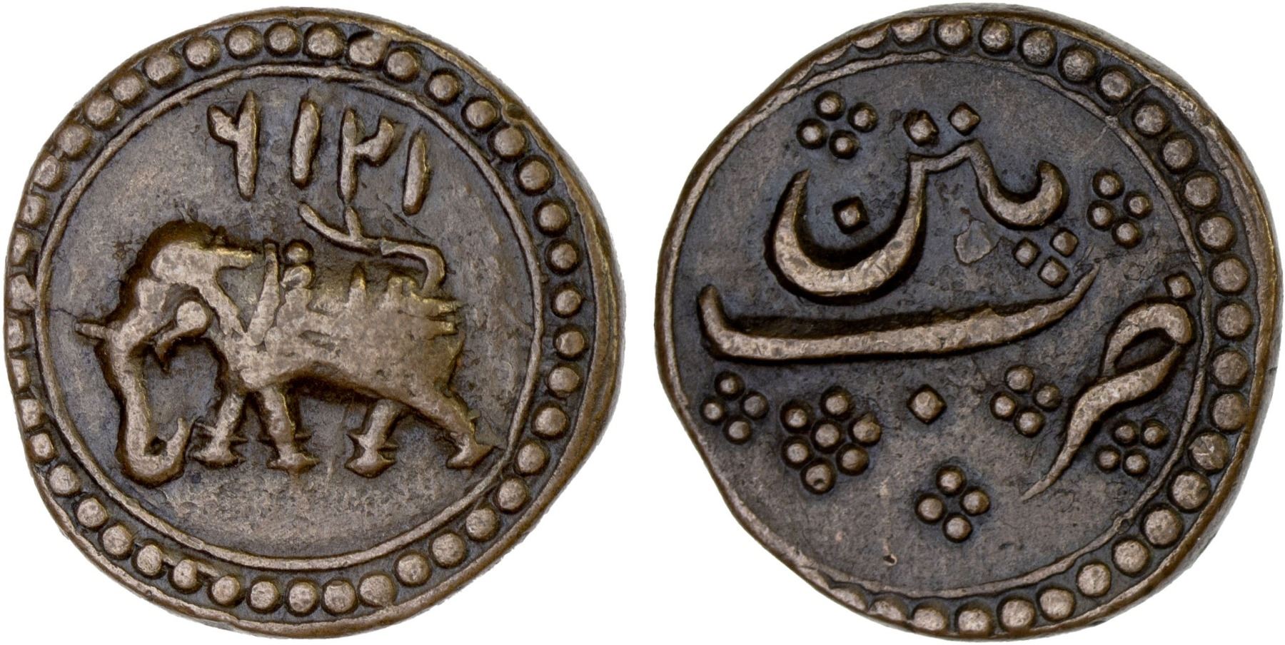MYSORE: Tipu Sultan, 1782-1799, AE 1/2 paisa (5.67g), Patan, AM1216, KM-122.1, elephant left, date above, beautiful strike, VF-XF.