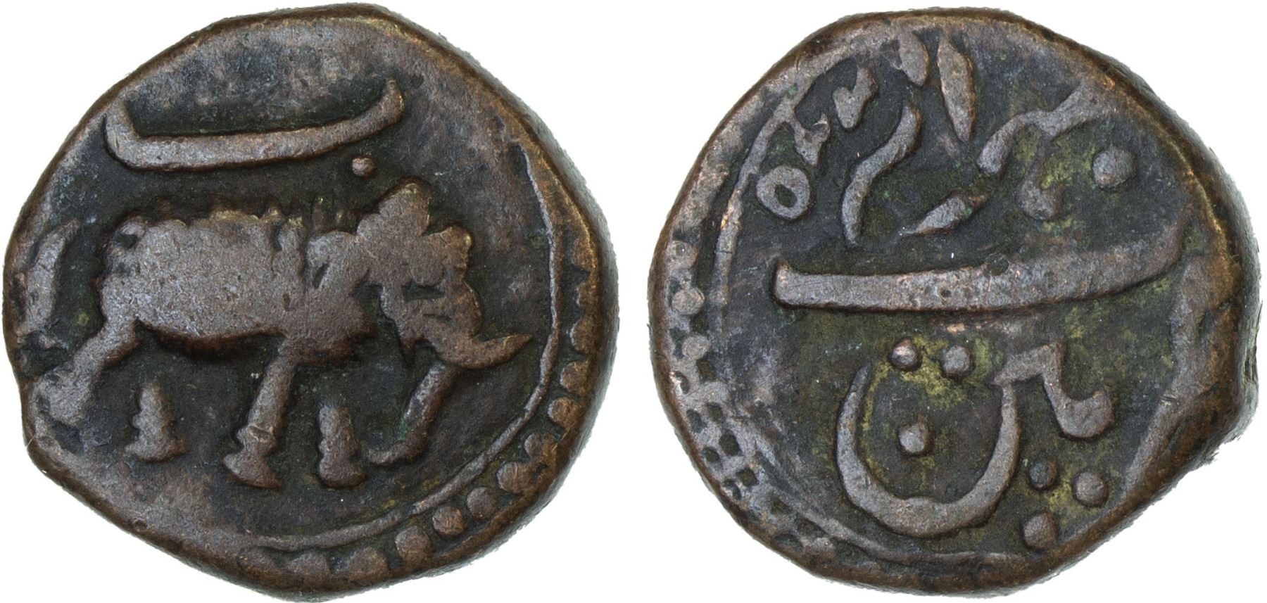 MYSORE: Tipu Sultan, 1782-1799, AE 1/2 paisa (bahram) (5.31g), Patan, AM1225, KM-122.6, elephant right, year 2 indicated by the Persian letter "be" above elephant, F-VF, ex Dr. Vincent John Adams Flynn Collection.