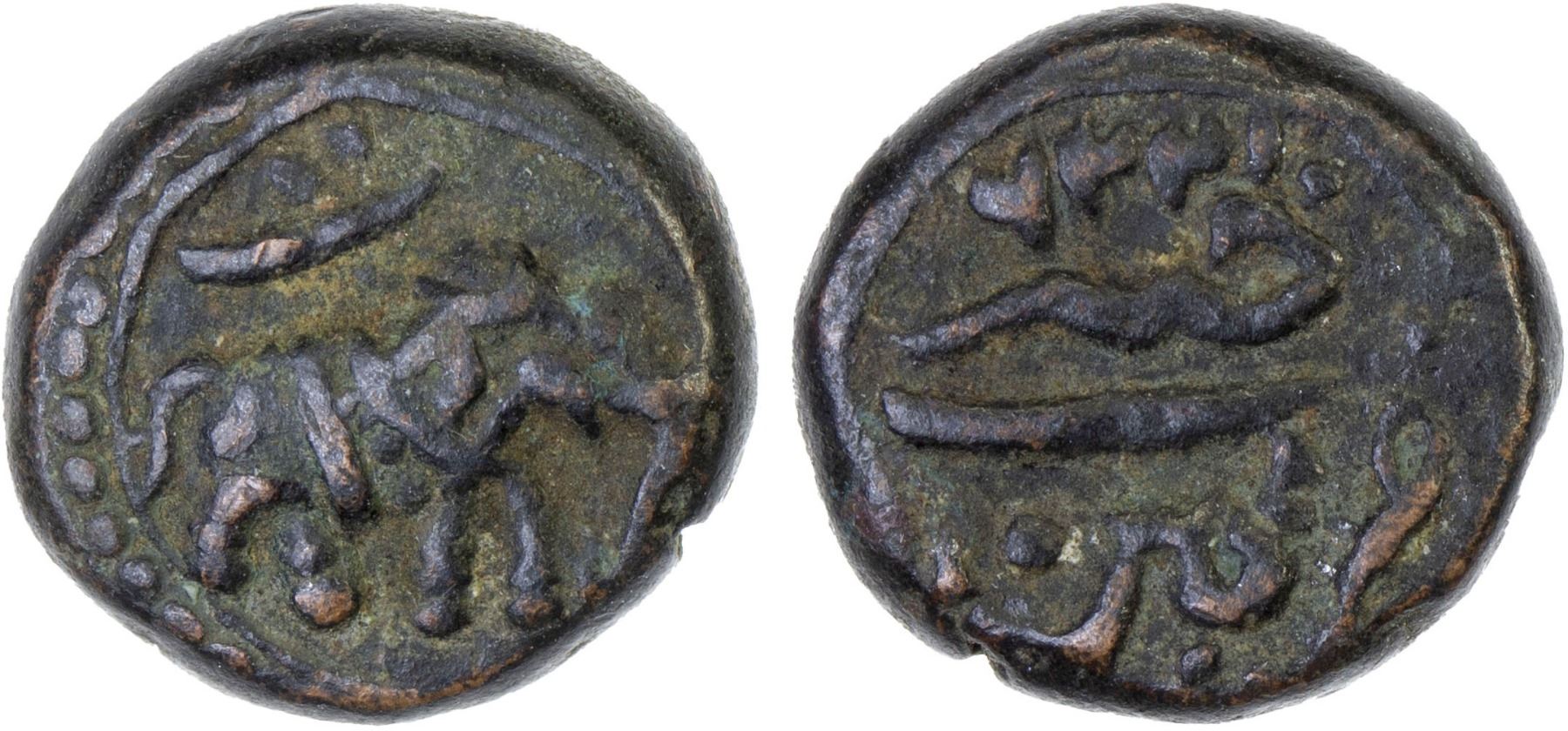 MYSORE: Tipu Sultan, 1782-1799, AE 1/4 paisa (akhtar) (2.95g), Patan, AM1226, KM-121.7, elephant right, year 3 indicated by the Persian letter "te" above elephant, VF, ex Dr. Vincent John Adams Flynn Collection.