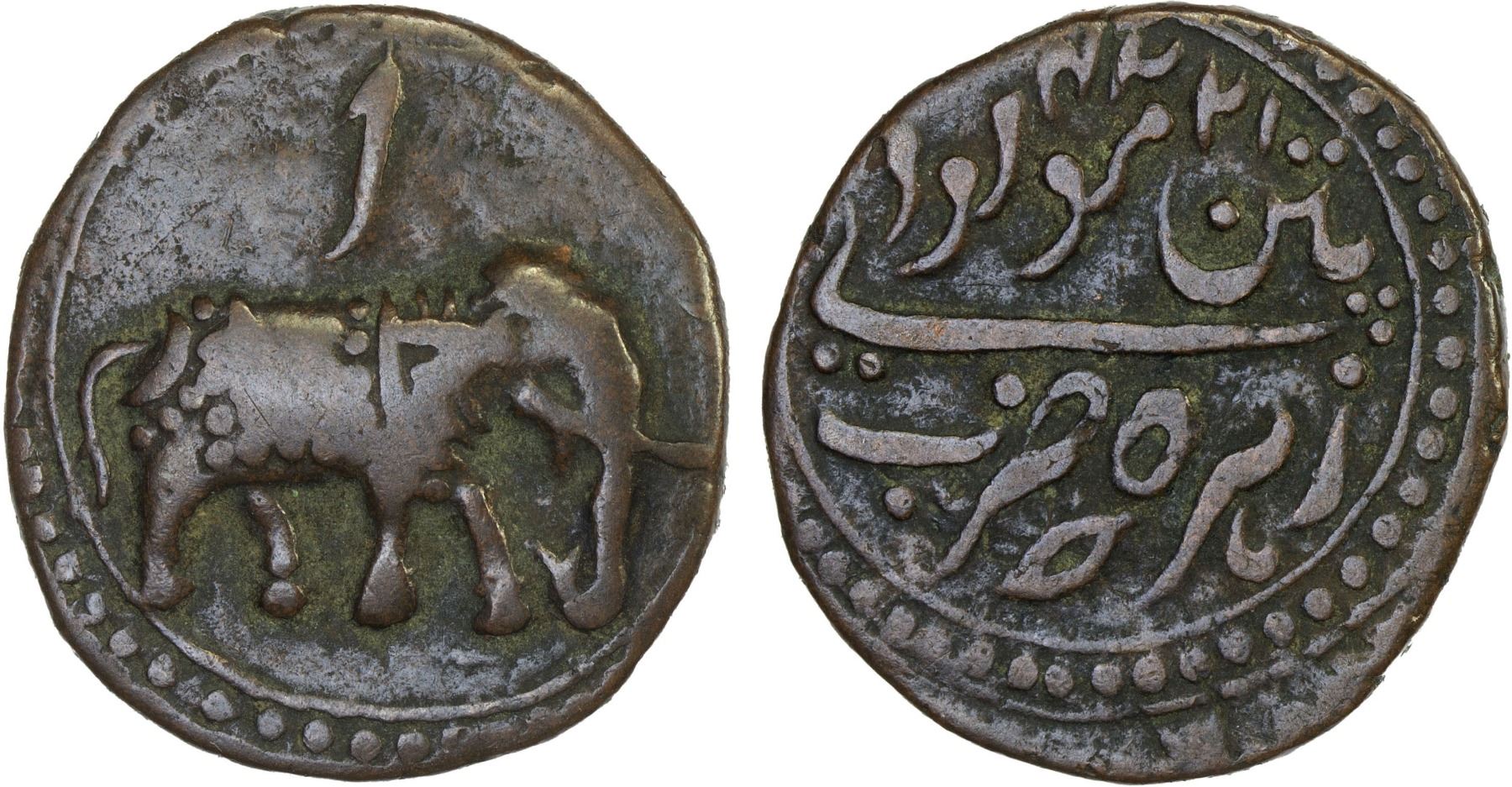 MYSORE: Tipu Sultan, 1782-1799, AE paisa (10.46g), Patan, ND, KM-123.6, elephant right, Persian letter alif above (for the numeral "1"), VF.