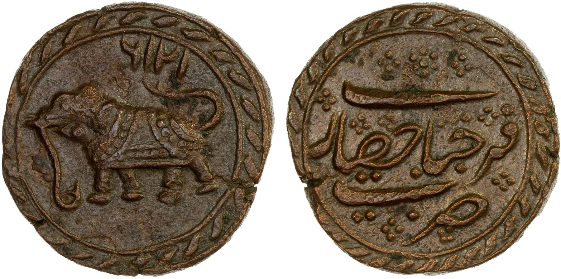 MYSORE: Tipu Sultan, 1782-1799, AE paisa (11.03g), Farrukhyab Hisar, AM1216, KM-63.1, elephant left, date above, bold XF.