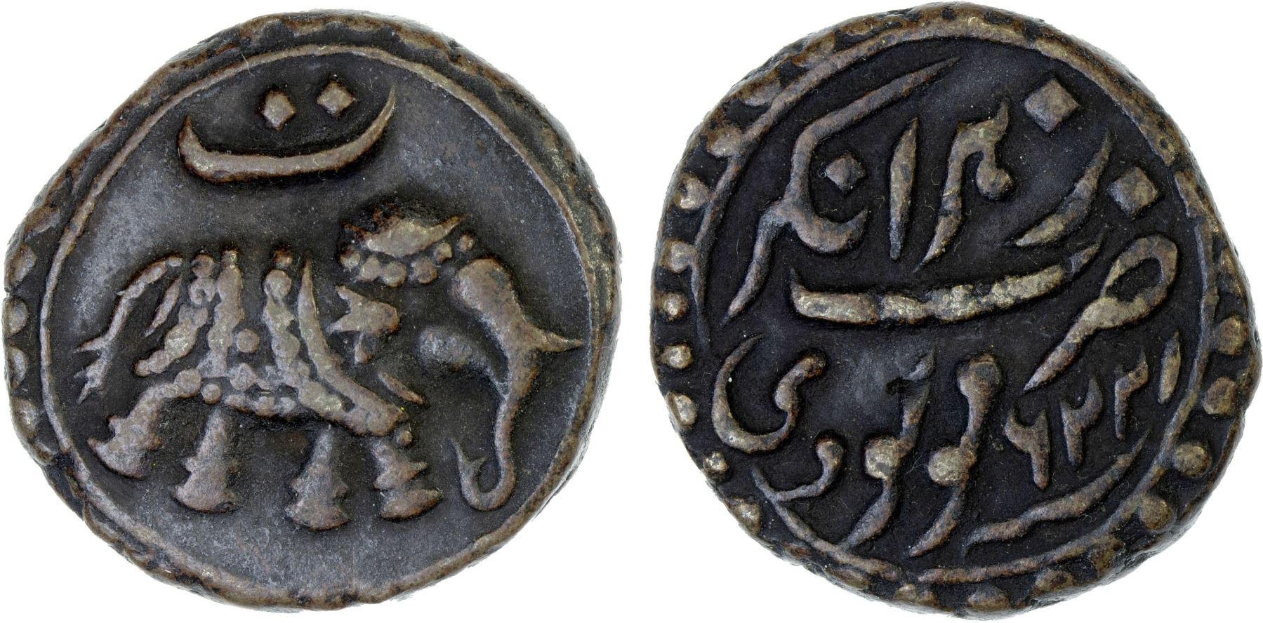 MYSORE: Tipu Sultan, 1782-1799, AE paisa (11.27g), Nagar, AM1226, KM-103.8, elephant right, year 3 indicated by the Persian letter "t" above the elephant, pleasing VF-XF.