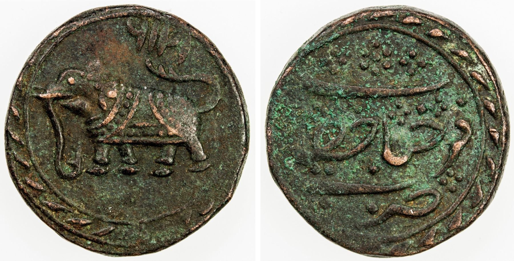 MYSORE: Tipu Sultan, 1782-1799, AE paisa (11.35g), Farrukhyab Hisar, AM1216, KM-63.1, nice patination, VF-XF.