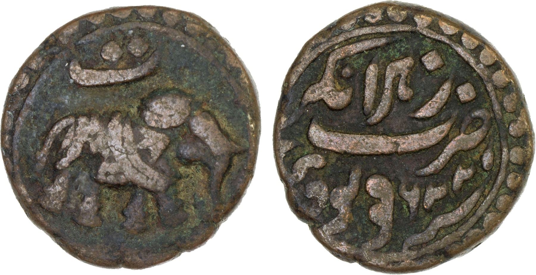 MYSORE: Tipu Sultan, 1782-1799, AE paisa (zohra) (10.64g), Nagar, AM1226, KM-103.8, elephant right, year 3 indicated by the Persian letter "te" above elephant, F-VF, ex Dr. Vincent John Adams Flynn Collection.