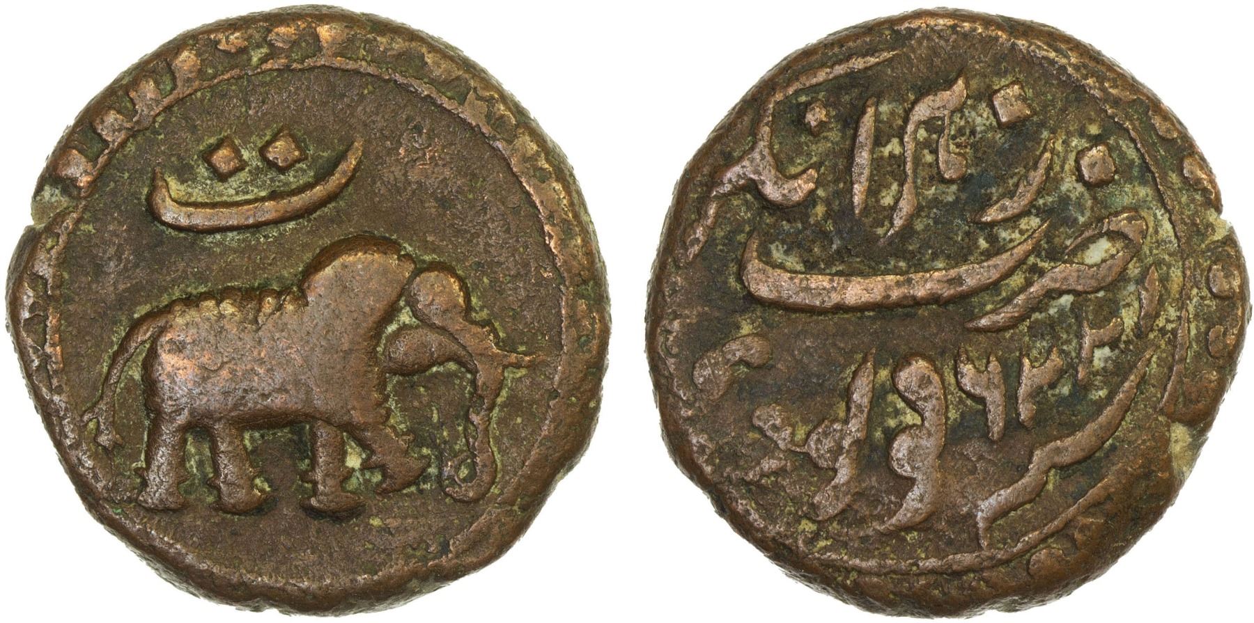 MYSORE: Tipu Sultan, 1782-1799, AE paisa (zohra) (10.72g), Nagar, AM1226, KM-103.8, elephant right, year 3 indicated by the Persian letter "te" above elephant, F-VF, ex Dr. Vincent John Adams Flynn Collection.