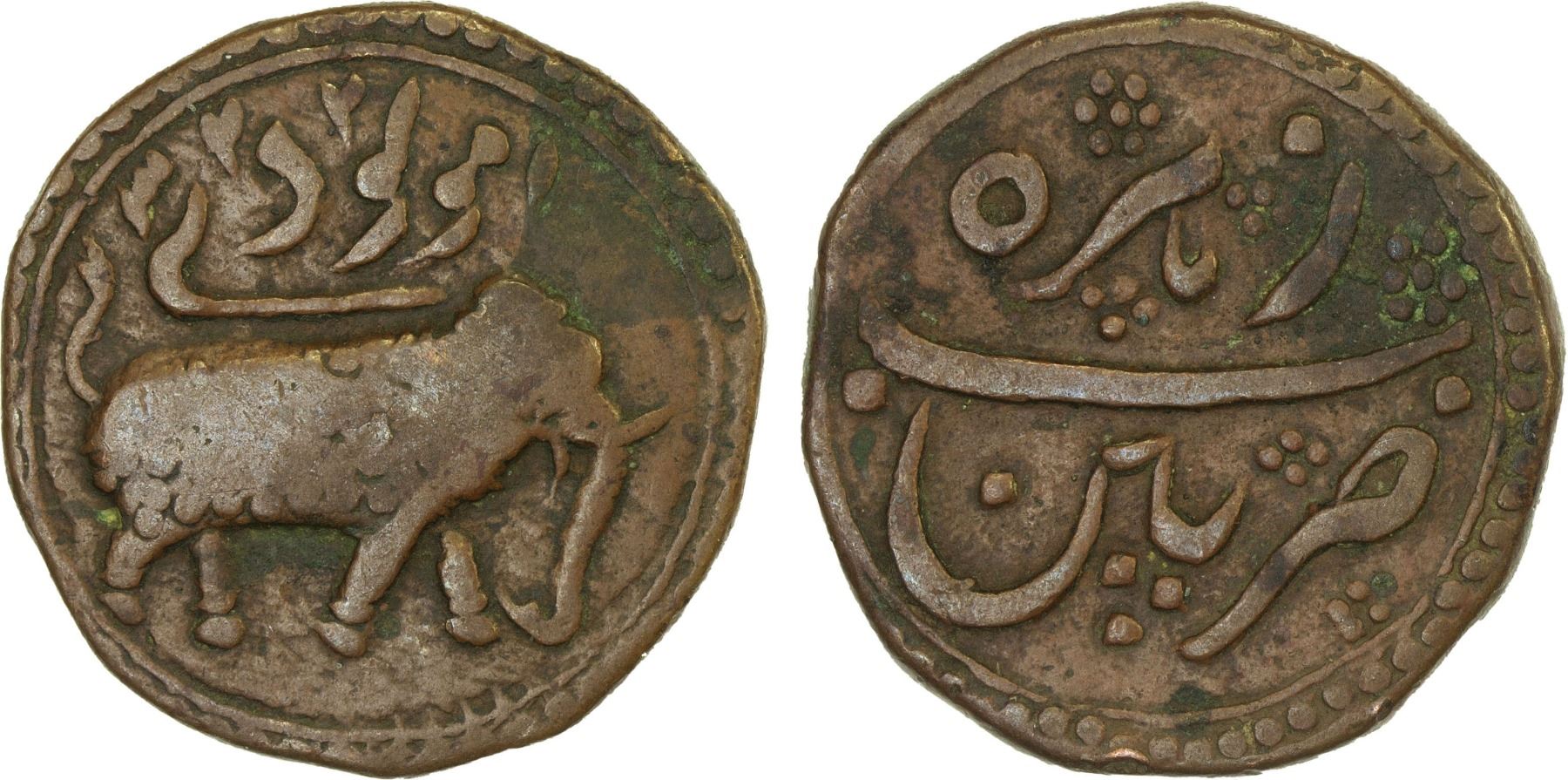 MYSORE: Tipu Sultan, 1782-1799, AE paisa (zohra) (10.94g), Patan, AM1223, KM-123.5, elephant right, F-VF, ex Dr. Vincent John Adams Flynn Collection.