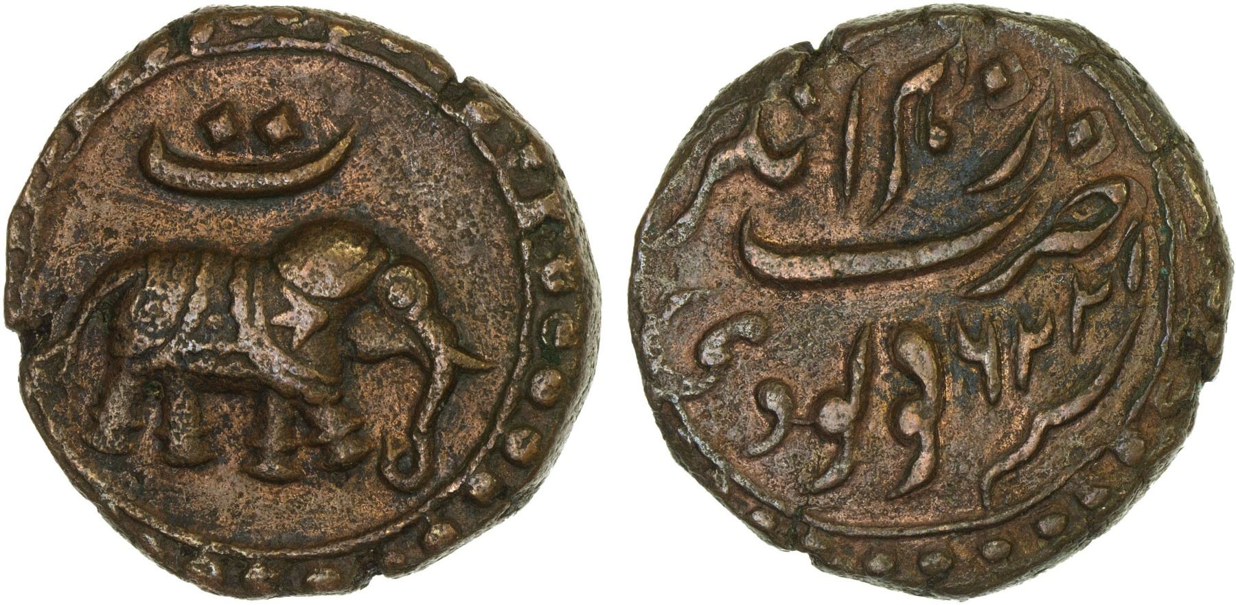 MYSORE: Tipu Sultan, 1782-1799, AE paisa (zohra) (10.95g), Nagar, AM1226, KM-103.8, elephant right, year 3 indicated by the Persian letter "te" above elephant, Persian zohra above on reverse, VF-XF, ex Dr. Vincent John Adams Flynn Collection.