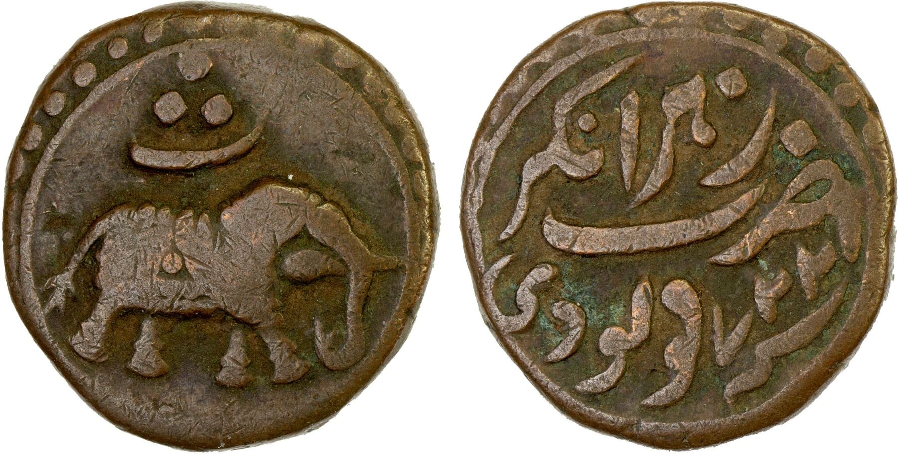 MYSORE: Tipu Sultan, 1782-1799, AE paisa (zohra) (10.95g), Nagar, AM1227, KM-103.9, elephant right, year 4 indicated by the Persian letter "se" above elephant, rare final date of this series, F-VF, ex Dr. Vincent John Adams Flynn Collection.