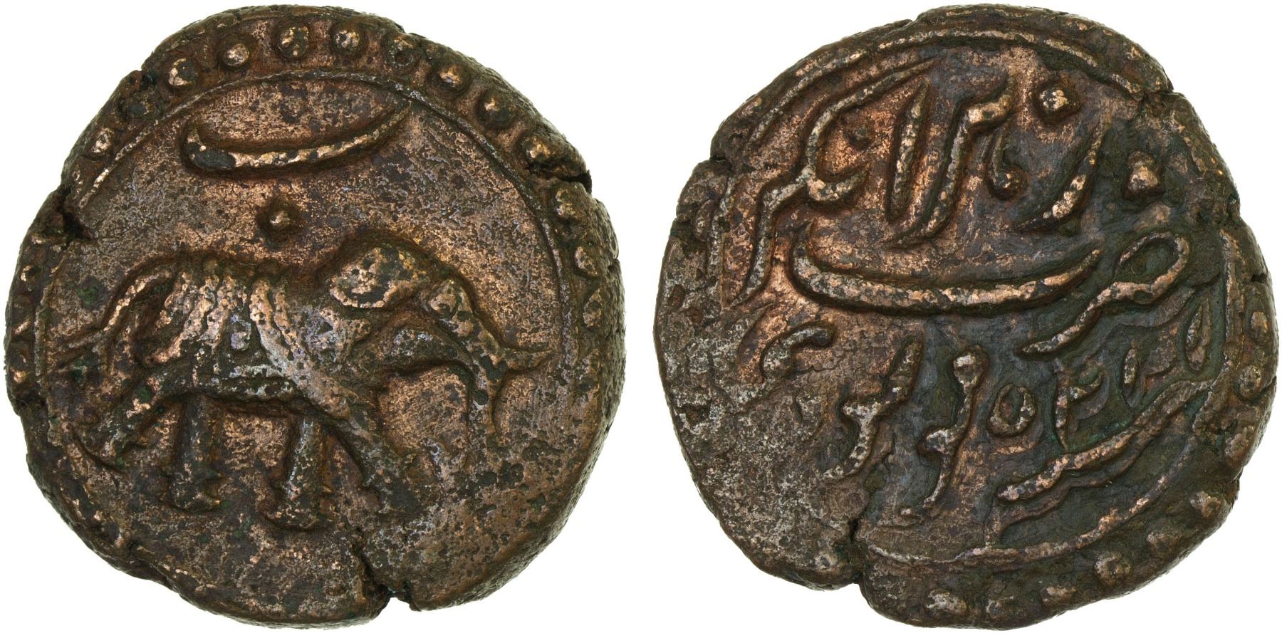 MYSORE: Tipu Sultan, 1782-1799, AE paisa (zohra) (10.99g), Nagar, AM1225, KM-103.7, elephant right, year 2 indicated by the Persian letter "be" above elephant, XF, ex Dr. Vincent John Adams Flynn Collection.