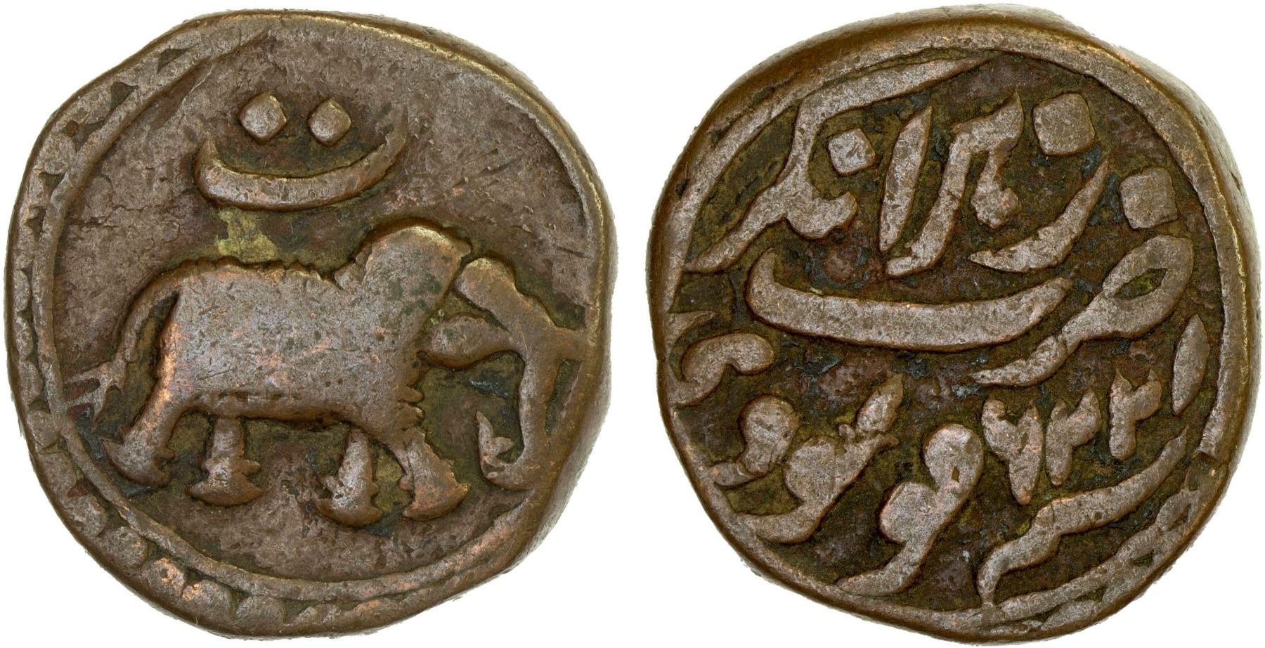 MYSORE: Tipu Sultan, 1782-1799, AE paisa (zohra) (11.03g), Nagar, AM1226, KM-103.8, elephant right, year 3 indicated by the Persian letter "te" above elephant, F-VF, ex Dr. Vincent John Adams Flynn Collection.