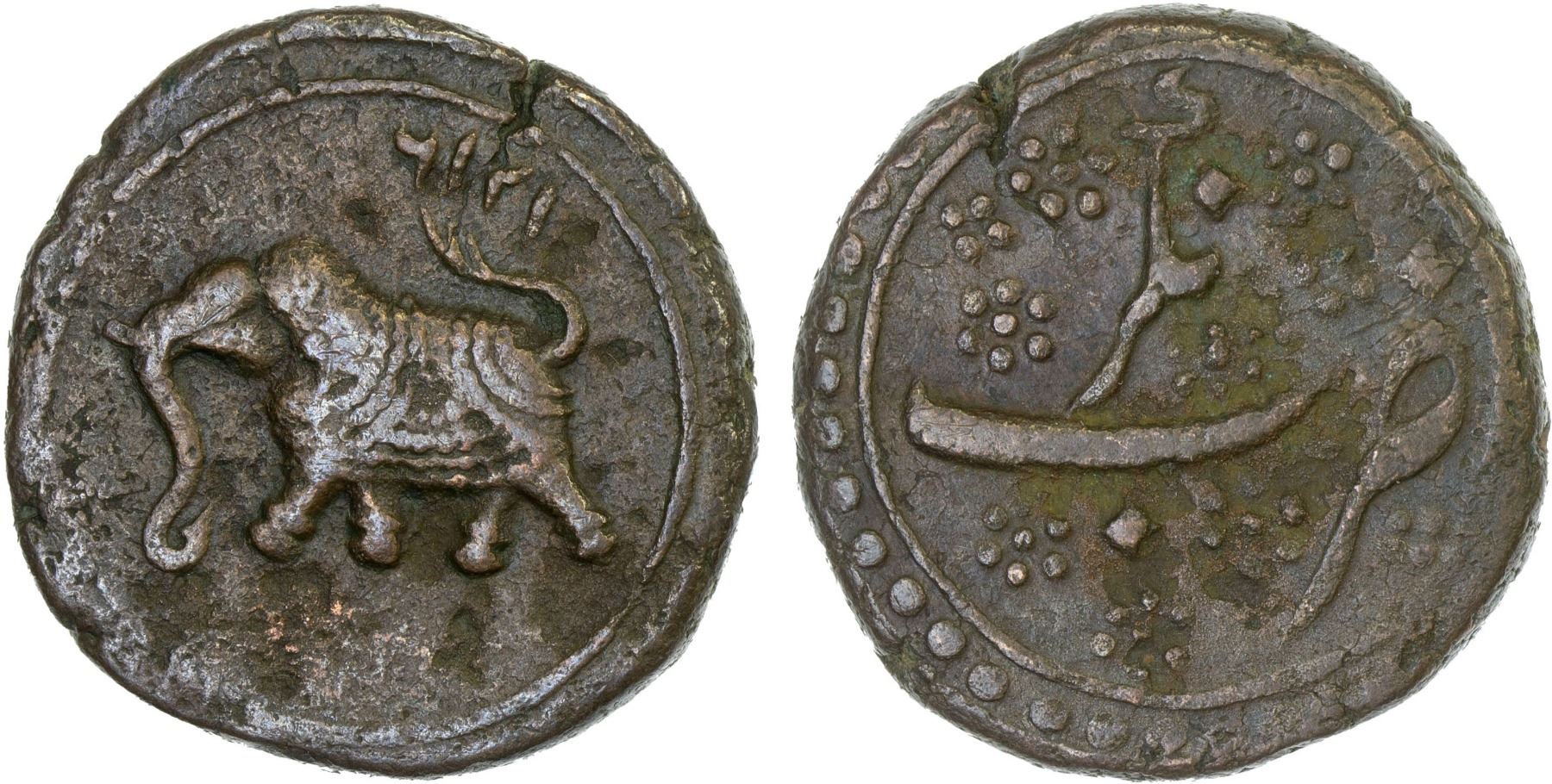MYSORE: Tipu Sultan, 1782-1799, AE paisa (zohra) (11.06g), Nagar, AM1216, KM-103.1, elephant right, some pitting, Fine, ex Dr. Vincent John Adams Flynn Collection.