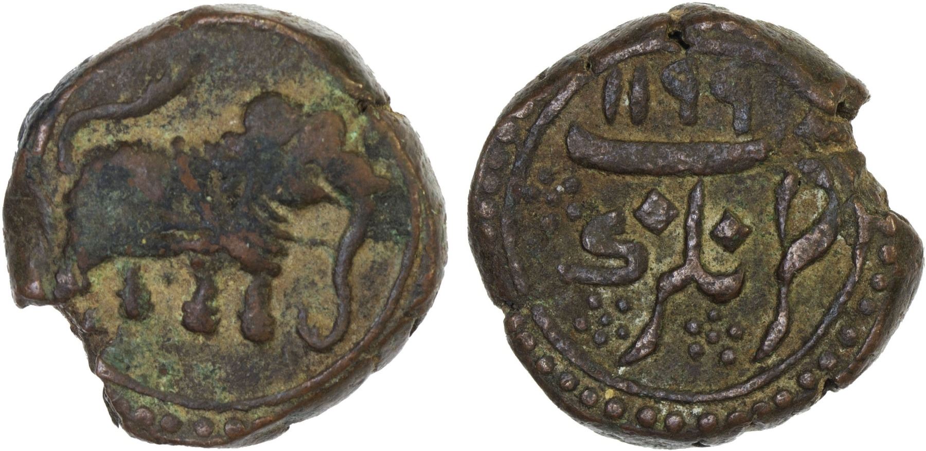 MYSORE: Tipu Sultan, 1782-1799, AE paisa (zohra) (11.11g), Nagar, AH1199, KM-103.1, elephant right, date above on reverse field, VF, ex Dr. Vincent John Adams Flynn Collection.