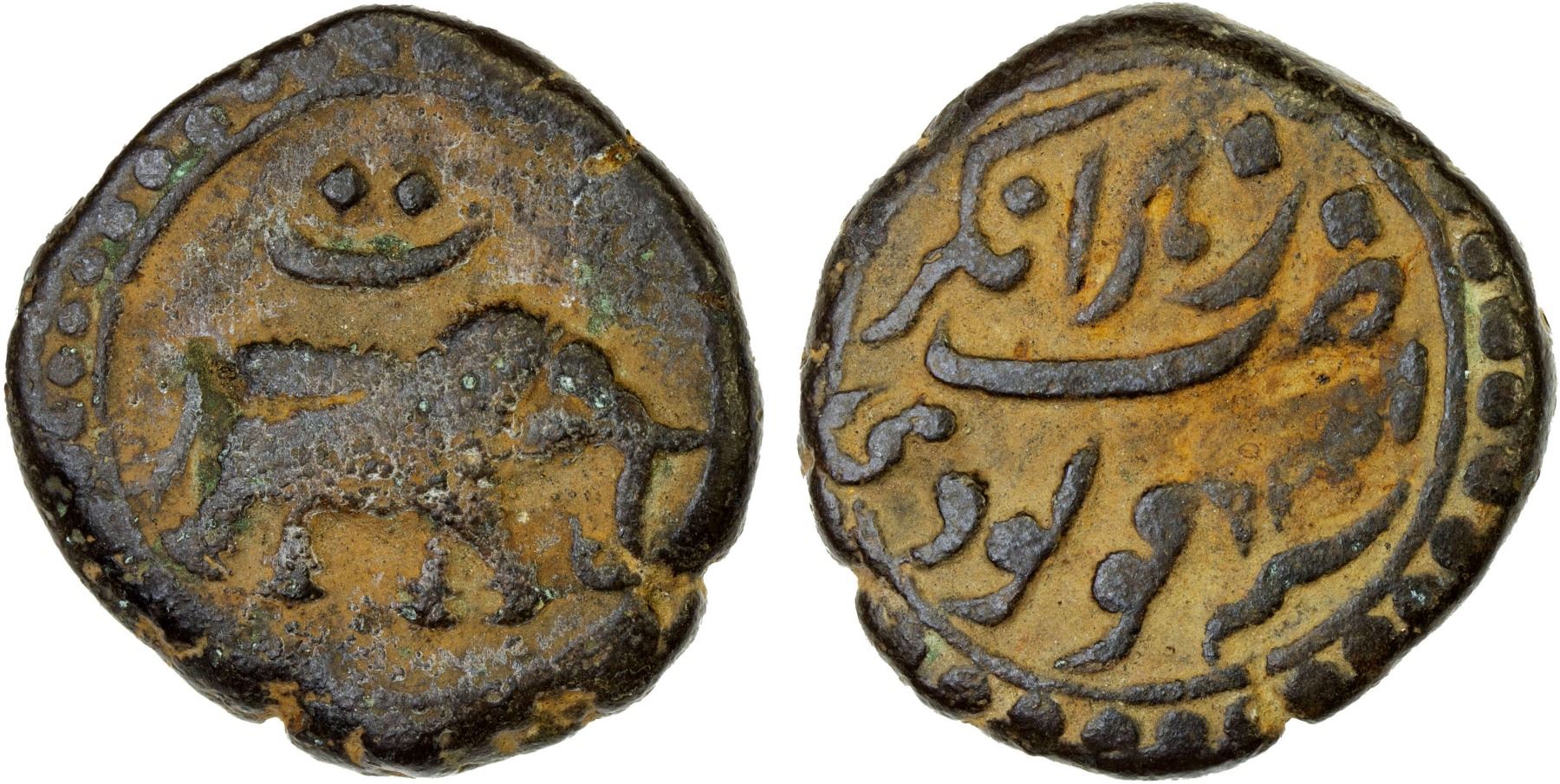 MYSORE: Tipu Sultan, 1782-1799, AE paisa (zohra) (11.11g), Nagar, AM1226, KM-103.8, elephant right, year 3 indicated by the Persian letter "te" above elephant, F-VF, ex Dr. Vincent John Adams Flynn Collection.