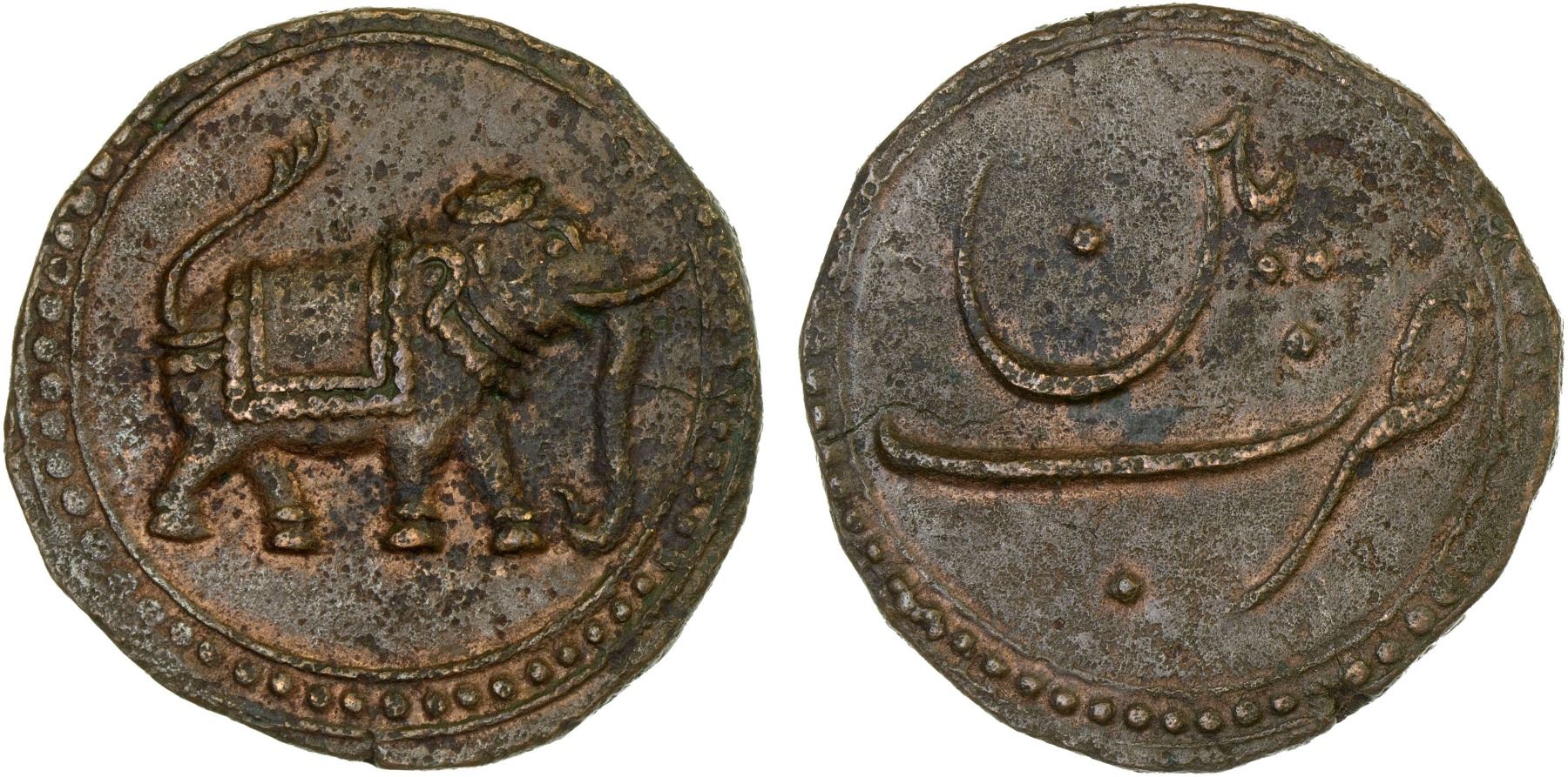 MYSORE: Tipu Sultan, 1782-1799, AE paisa (zohra) (11.21g), Patan, ND, KM-123.9, elephant right, undated type, light porosity, XF, ex Dr. Vincent John Adams Flynn Collection.
