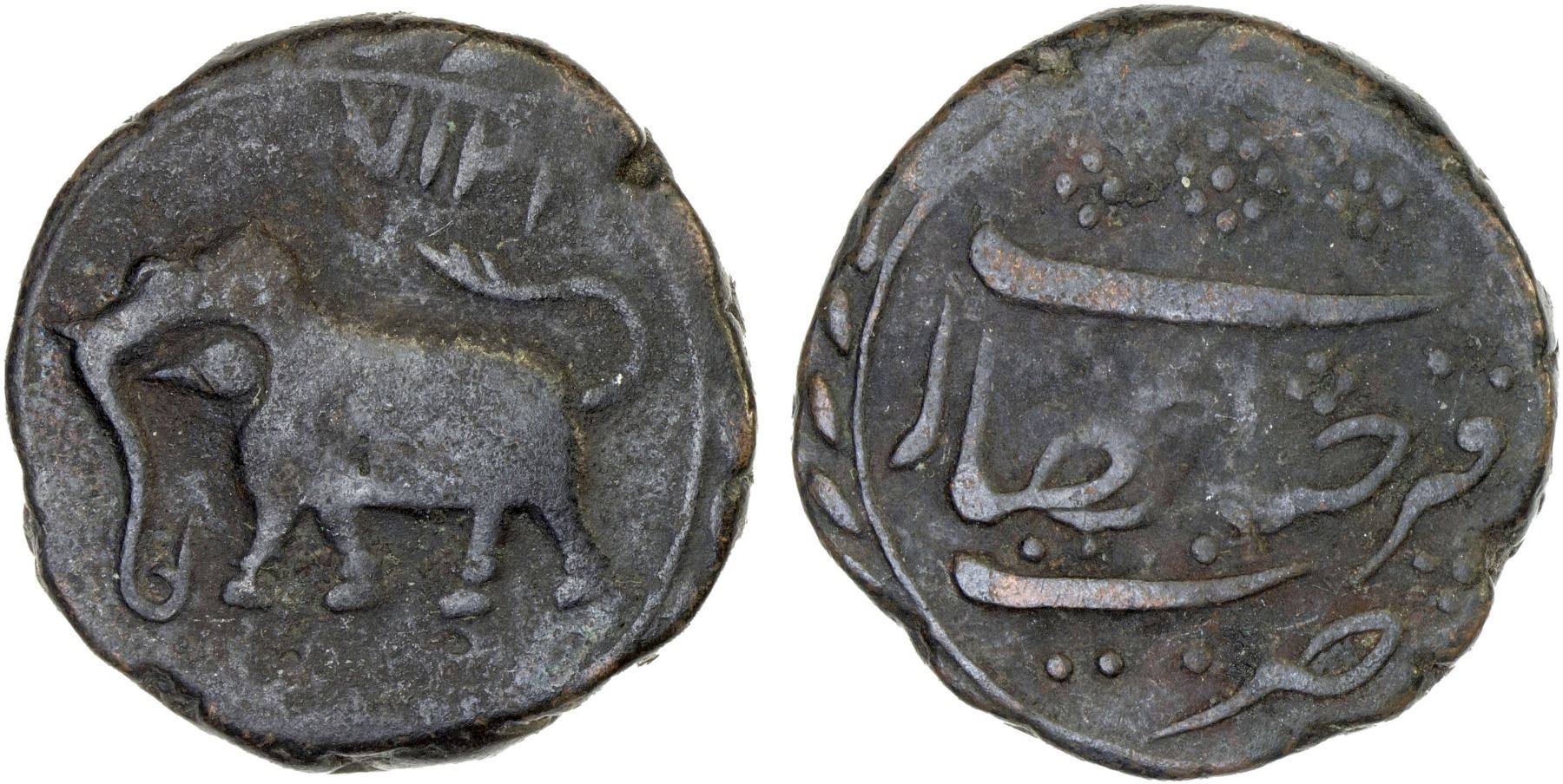 MYSORE: Tipu Sultan, 1782-1799, AE paisa (zohra) (11.25g), Farrukhyab-Hisar, AM1217, KM-63.1, elephant left, VG-F, ex Dr. Vincent John Adams Flynn Collection.