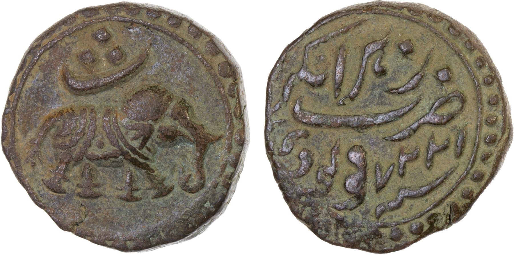 MYSORE: Tipu Sultan, 1782-1799, AE paisa (zohra) (11.25g), Nagar, AM1227, KM-103.9, elephant right, year 4 indicated by the Persian letter "se" above elephant, zohra right of mint name, VF-XF, ex Dr. Vincent John Adams Flynn Collection.
