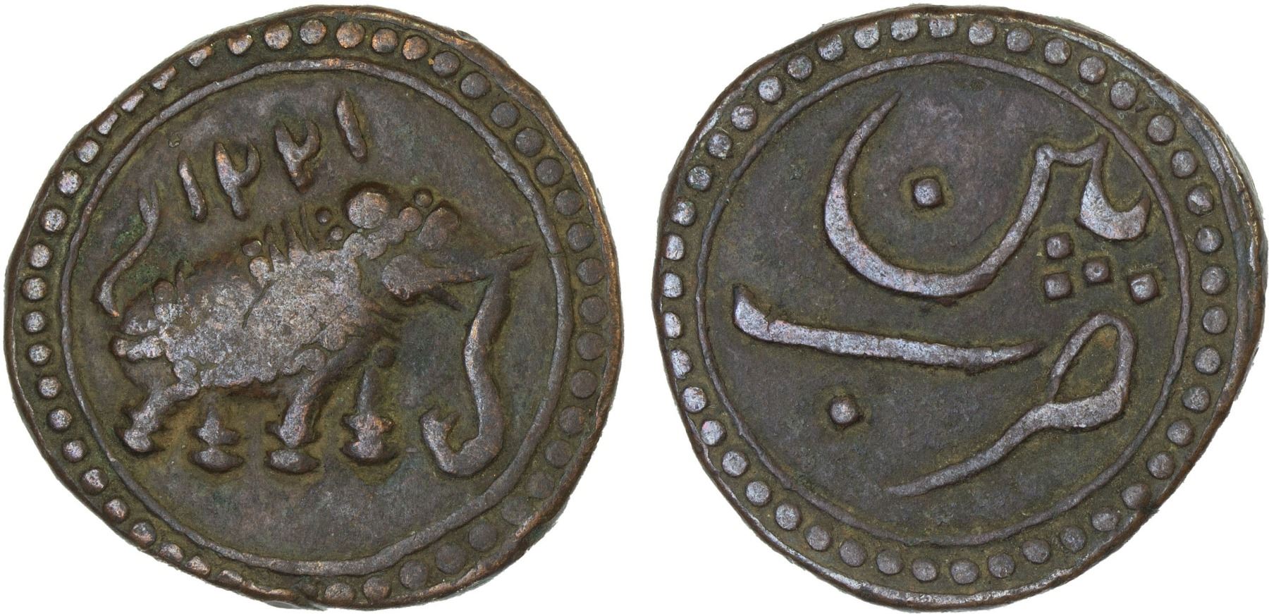 MYSORE: Tipu Sultan, 1782-1799, AE paisa (zohra) (11.31g), Patan, AM1221, KM-123.1, elephant right, F-VF, ex Dr. Vincent John Adams Flynn Collection.