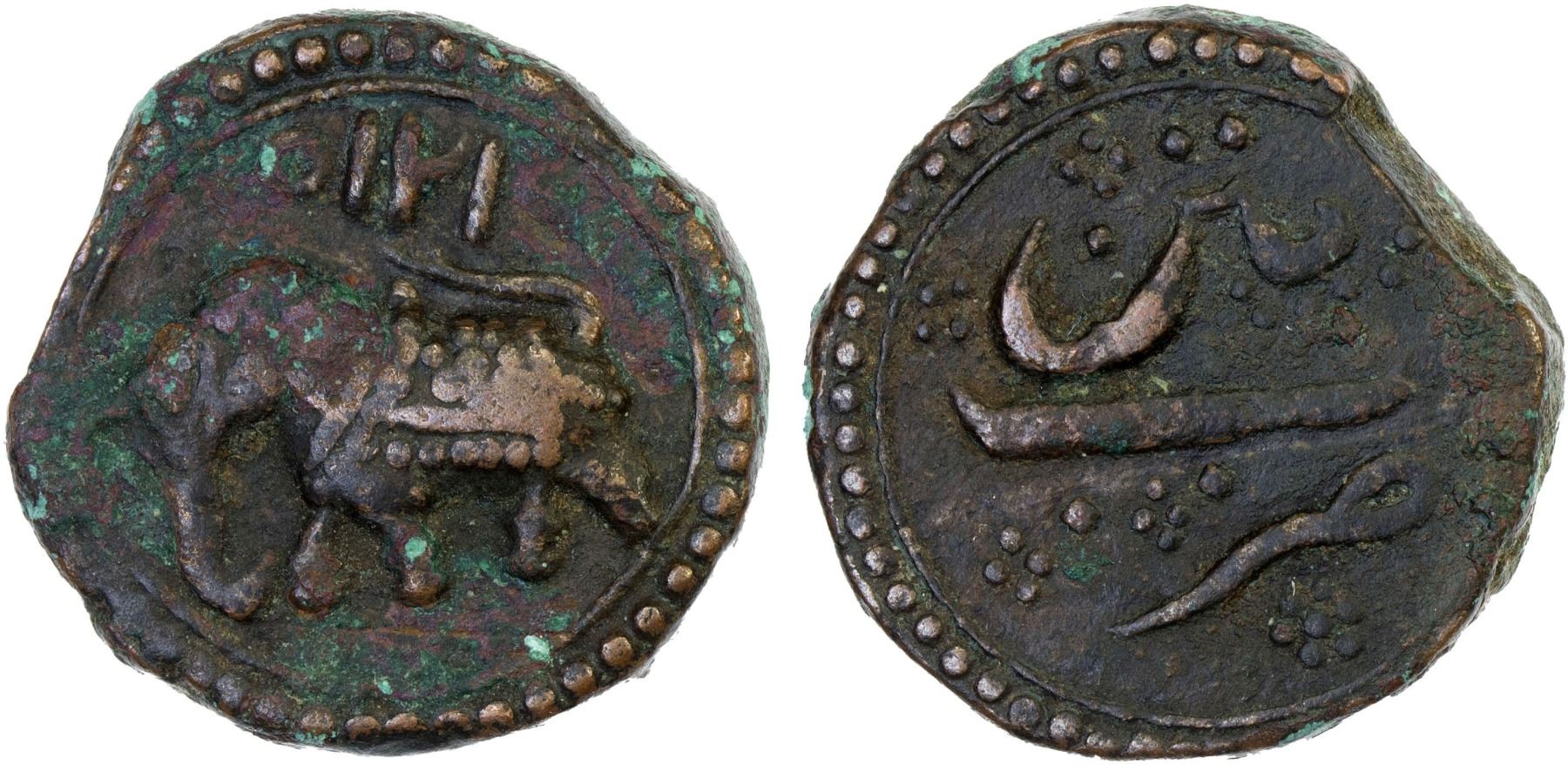MYSORE: Tipu Sultan, 1782-1799, AE paisa (zohra) (11.31g), Patan, AM1224, KM-123.1, elephant left, F-VF, ex Dr. Vincent John Adams Flynn Collection.
