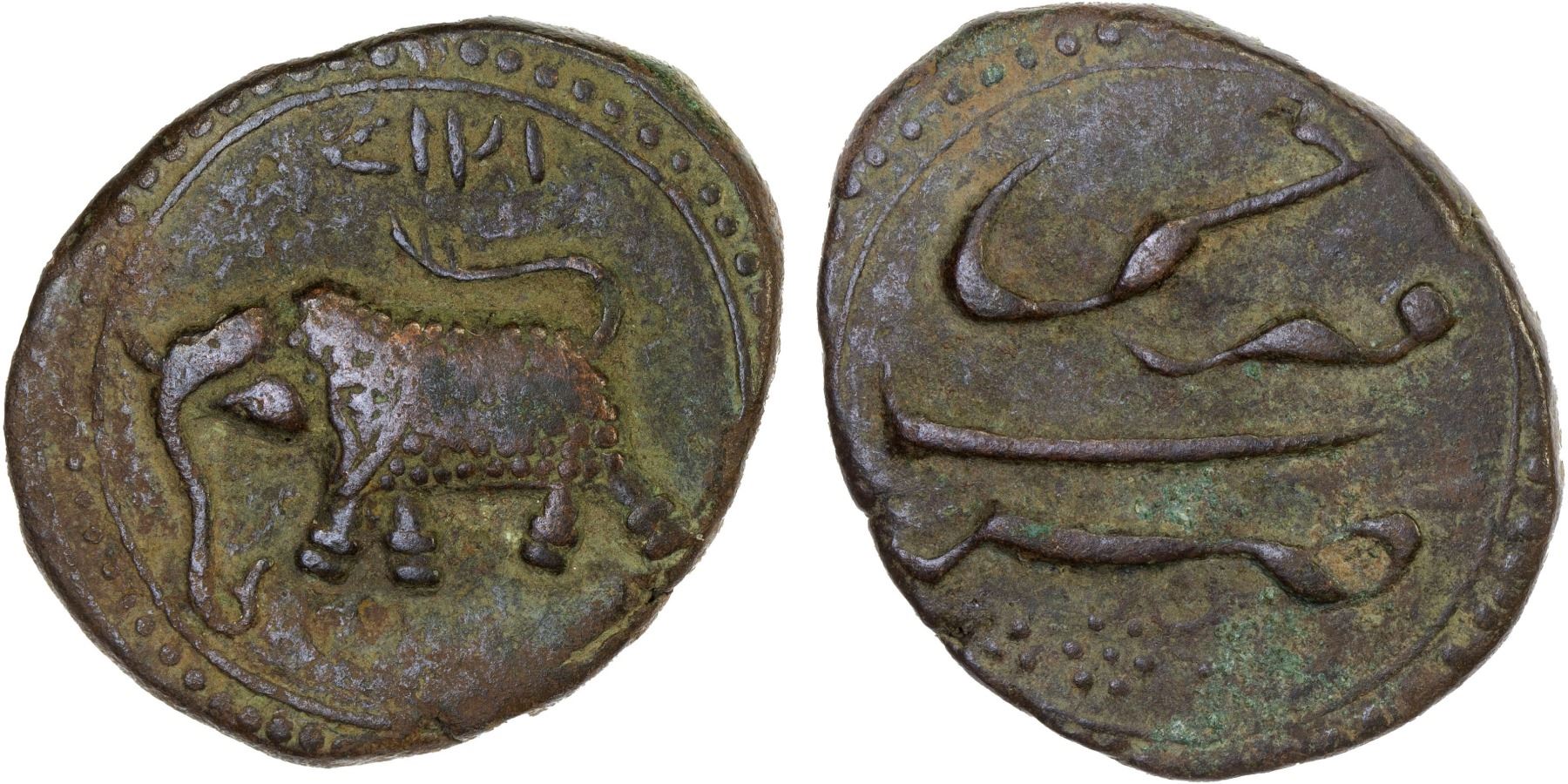 MYSORE: Tipu Sultan, 1782-1799, AE paisa (zohra) (11.34g), Farrukhi, AH1218, KM-53.2, elephant left, VF, ex Dr. Vincent John Adams Flynn Collection.