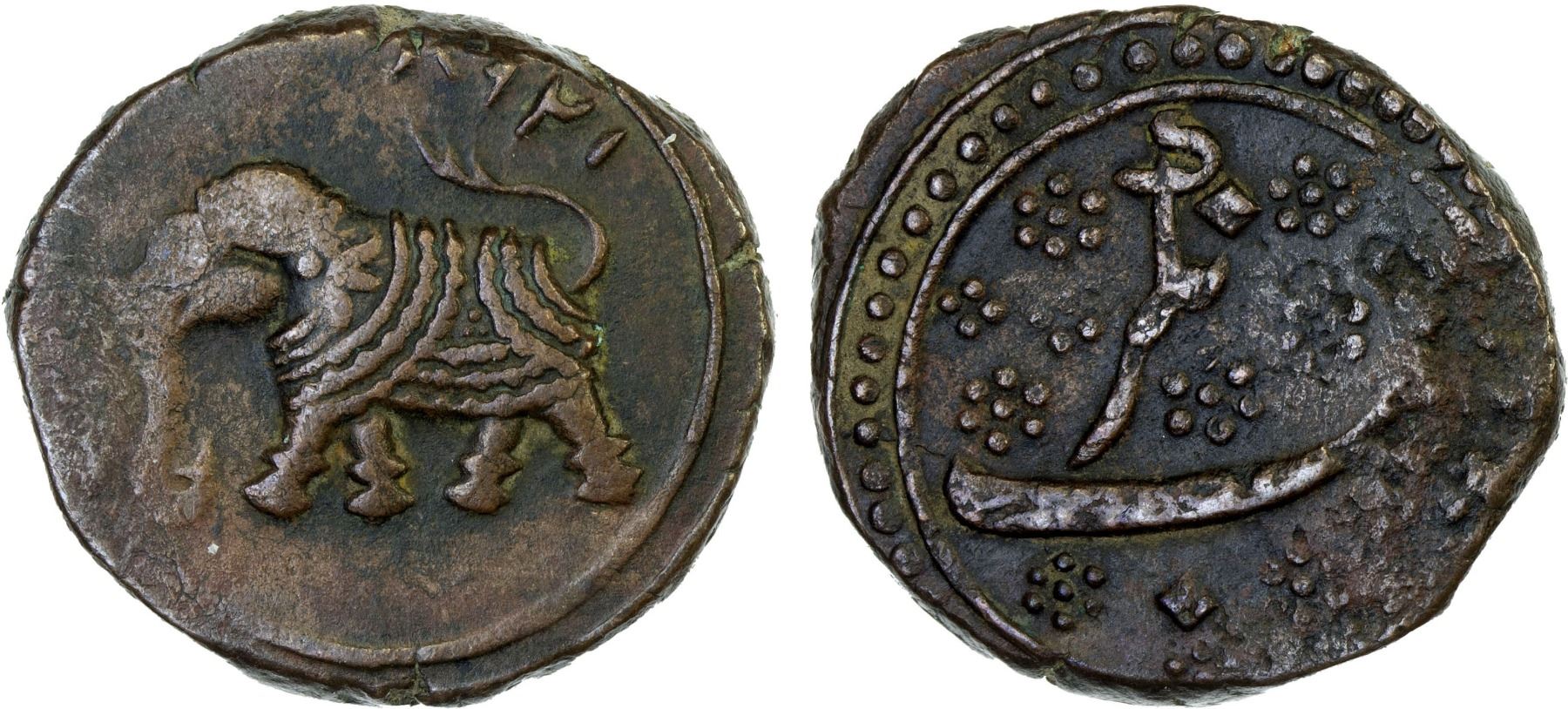 MYSORE: Tipu Sultan, 1782-1799, AE paisa (zohra) (11.35g), Nagar, AM1218, KM-103.10, elephant left, F-VF, ex Dr. Vincent John Adams Flynn Collection.