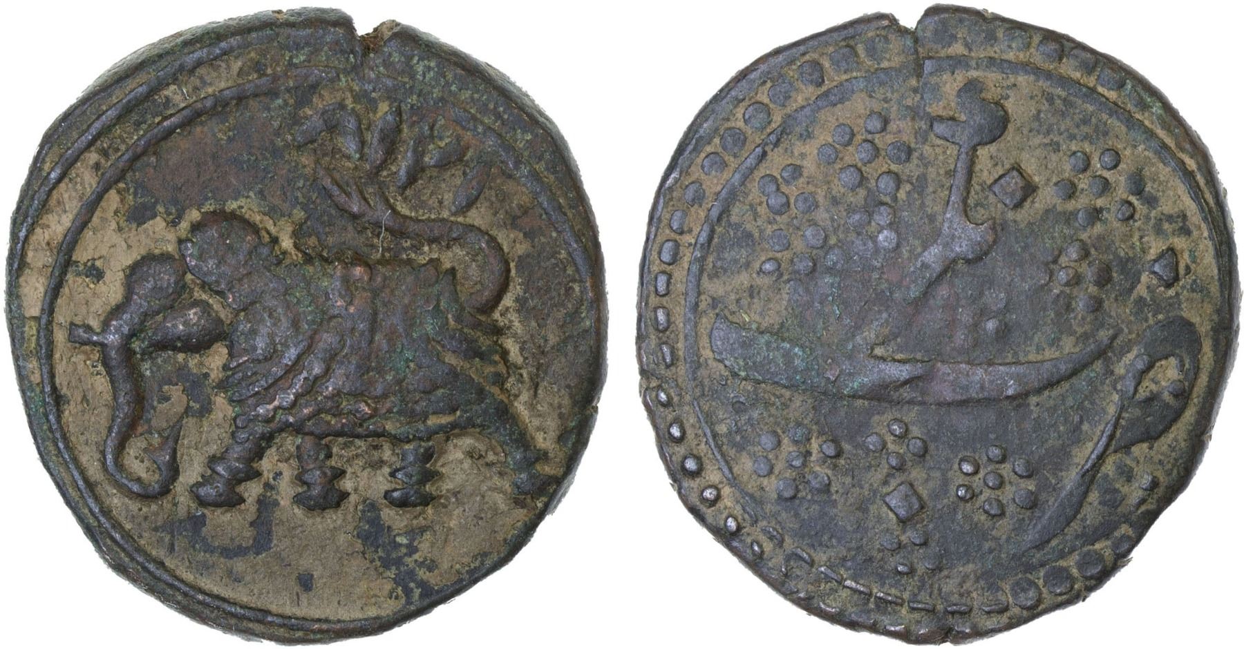 MYSORE: Tipu Sultan, 1782-1799, AE paisa (zohra) (11.41g), Nagar, AM1217, KM-103.1, elephant right, Fine, ex Dr. Vincent John Adams Flynn Collection.