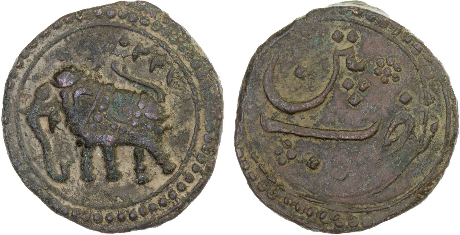 MYSORE: Tipu Sultan, 1782-1799, AE paisa (zohra) (11.56g), Patan, AM1220, KM-123.1, elephant left, VF, ex Dr. Vincent John Adams Flynn Collection.