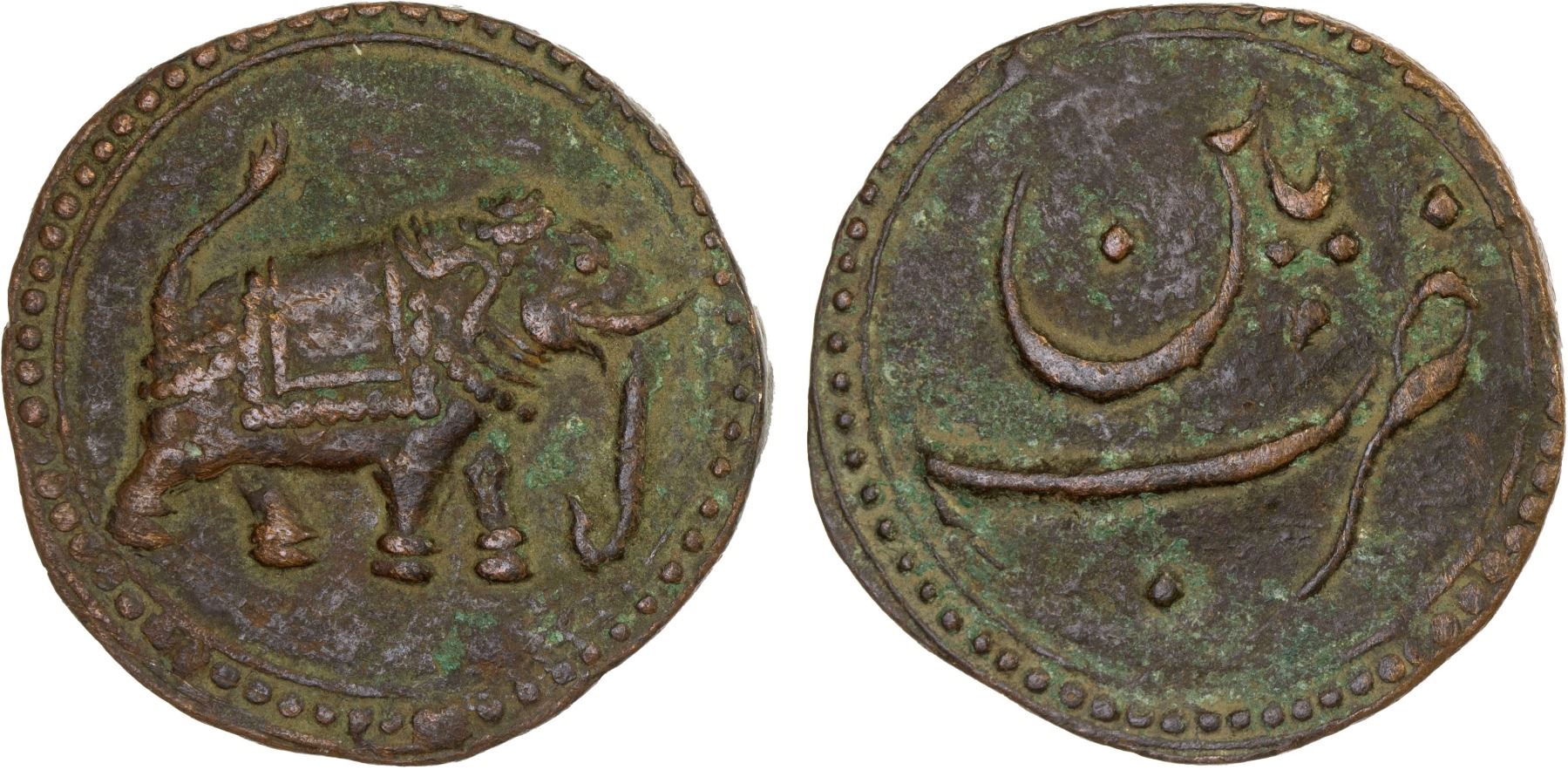 MYSORE: Tipu Sultan, 1782-1799, AE paisa (zohra) (11.64g), Patan, ND, KM-123.9, elephant right, undated type on large planchet, VF-XF, ex Dr. Vincent John Adams Flynn Collection.