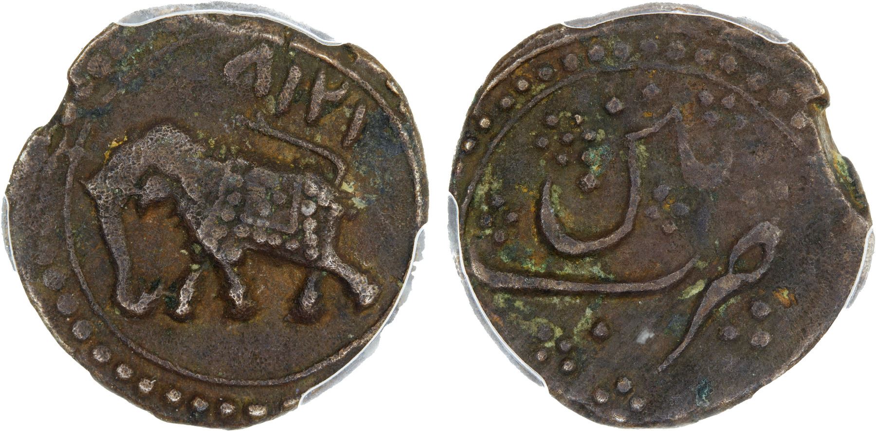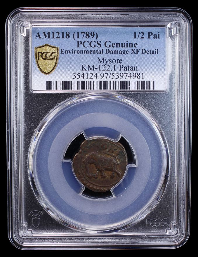 MYSORE: Tipu Sultan, 1782-1799, AR 1/4 paisa, Patan, AH1224 year one, KM-122.1, elephant left; environmental damage, PCGS graded XF details.