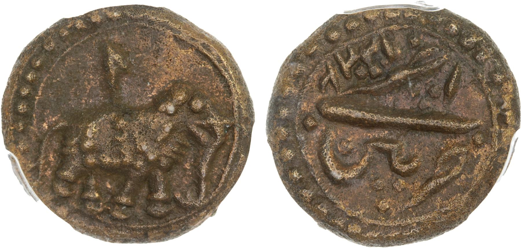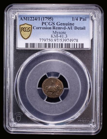 MYSORE: Tipu Sultan, 1782-1799, AR 1/4 paisa, Patan, AM1224 year one, KM-121.5, elephant right; corrosion removed, bold strike, year "one" indication by the letter alif, PCGS graded AU details, R.