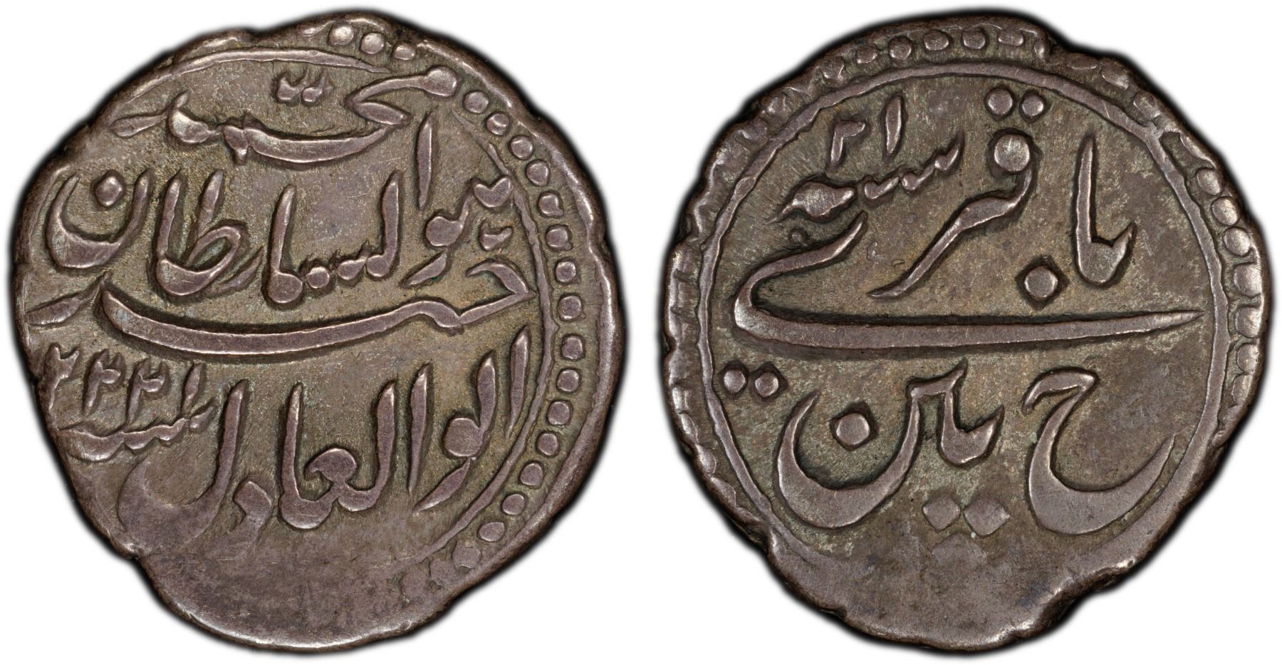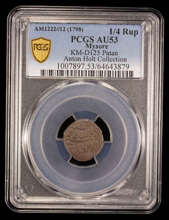 MYSORE: Tipu Sultan, 1782-1799, AR 1/4 rupee (baqiri) (2.77g), Patan, AM1222 year 12, KM-D125, with collector's original index card with provenance and date of purchase, PCGS graded AU53, ex Anton Holt Collection.