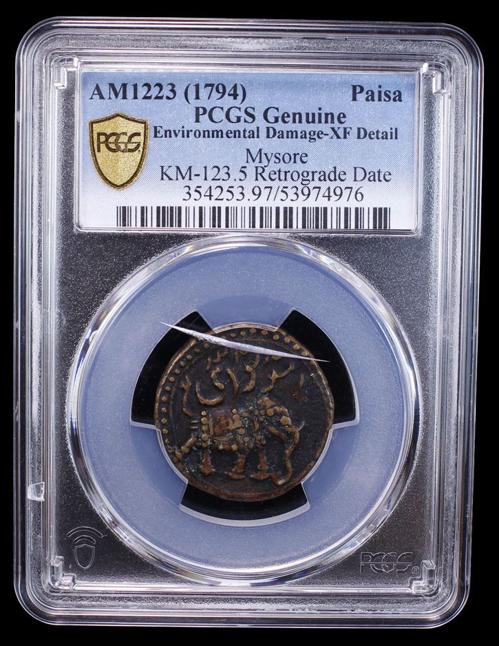 MYSORE: Tipu Sultan, 1782-1799, AR paisa, Patan, AM1223, KM-123.5, elephant right; environmental damage (very minor), PCGS graded XF details, R.