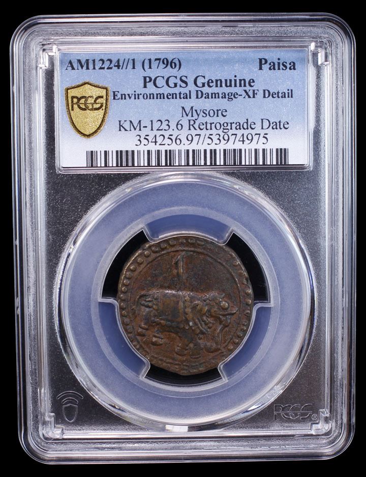 MYSORE: Tipu Sultan, 1782-1799, AR paisa, Patan, AM1224 year one, KM-123.6, elephant right; environmental damage, bold strike, year "one" indication by the letter alif, PCGS graded XF details, R.