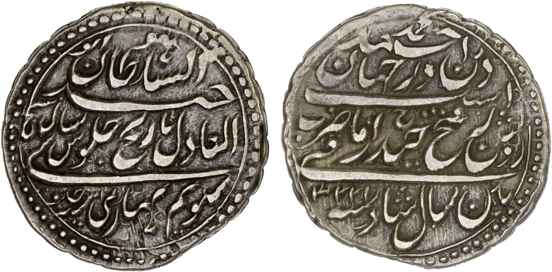 MYSORE: Tipu Sultan, 1782-1799, AR rupee (11.30g), Patan, AM1223 year 13, KM-126, Henderson-60, also citing cyclical year 49, trace of mounting (visiting almost only on the edge), very rare date, strong VF, RR.