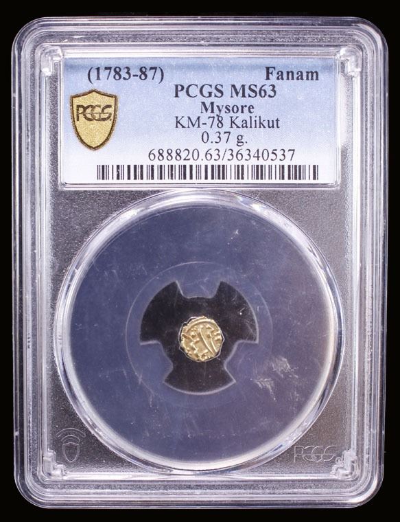 MYSORE: Tipu Sultan, 1782-1799, AV fanam (0.37g), Kalikut, AH120x, KM-78, superb strike, PCGS graded MS65.