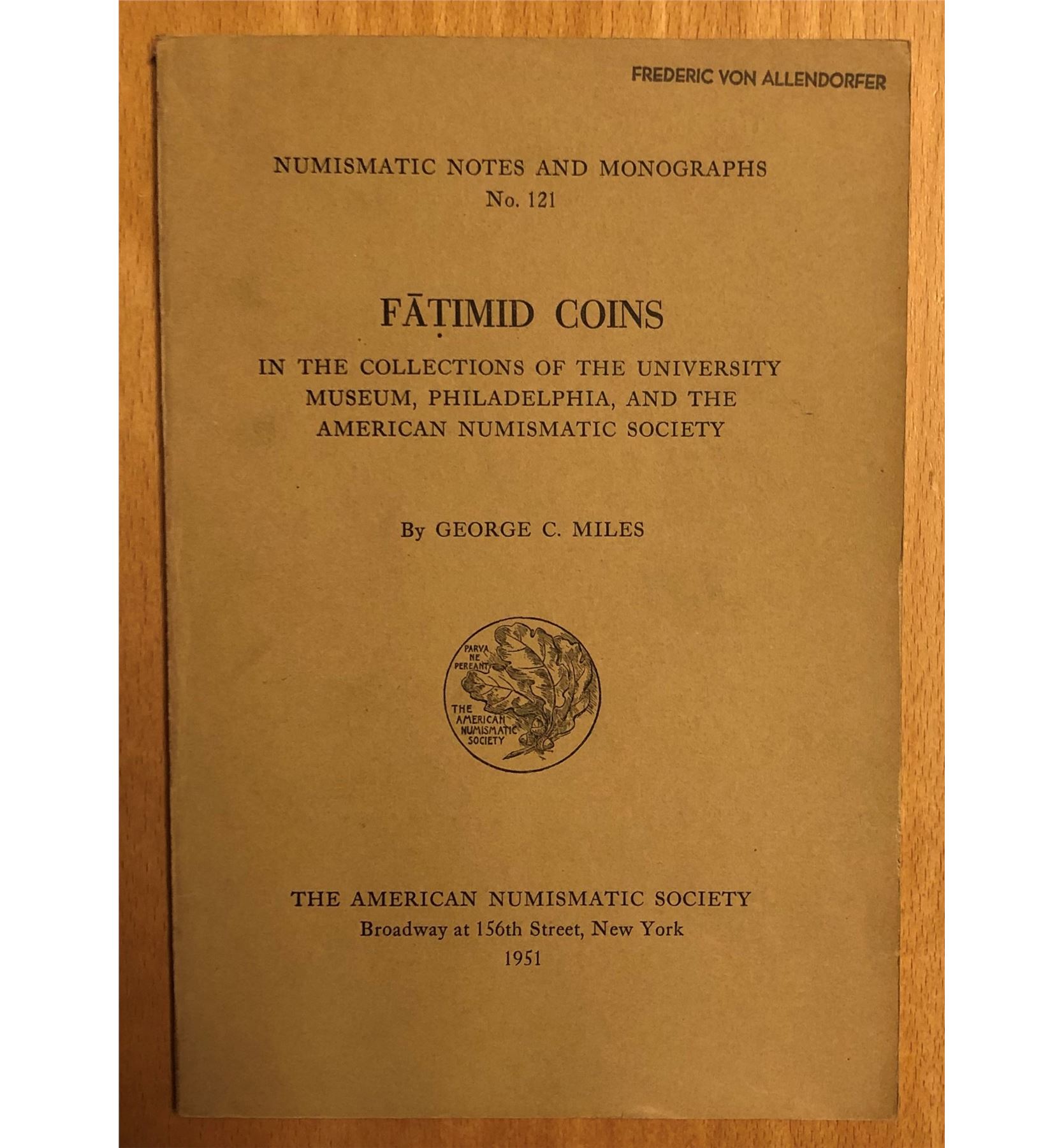 Miles, George C., Fatimid Coins in the Collections of the University Museum, Philadelphia, and the American Numismatic Society, Numismatic Notes and Monographs No. 121. American Numismatic Society, New York, 1951, 51 pages, 6 plates, softcover. A listing of coins with many photographs issued by the Fatimid dynasty in Egypt, Syria and Sicily. Some descriptions include legends written out in Arabic, but not translated. There is a list of Fatimid mints with known dates that they were in operation, ex James Farr Numismatic Library.
