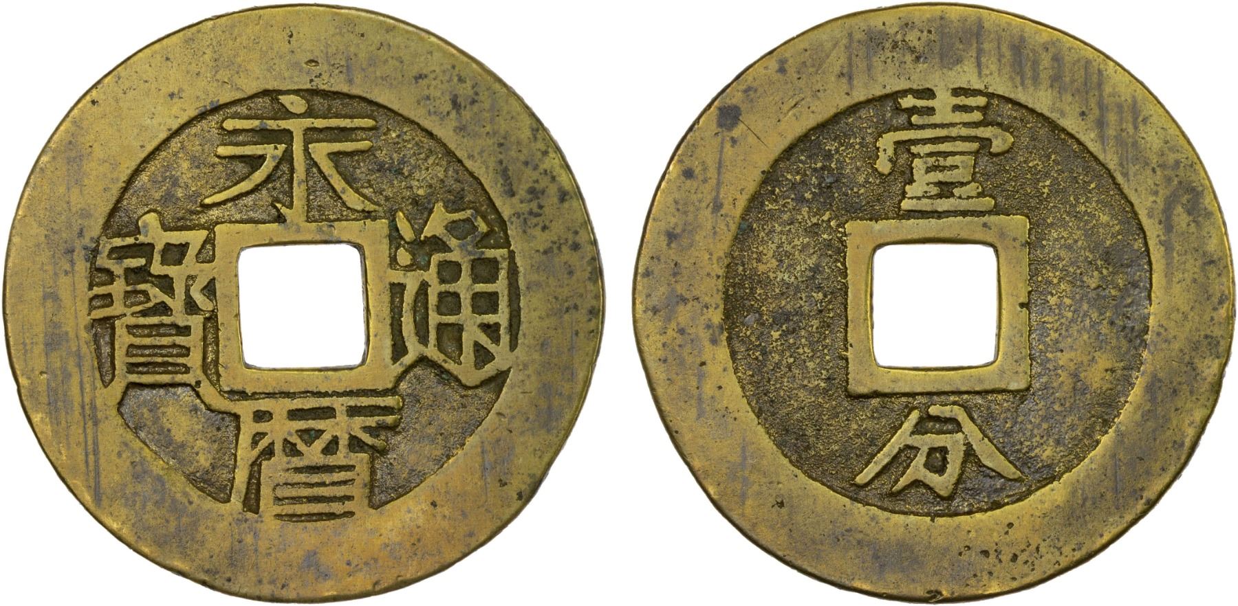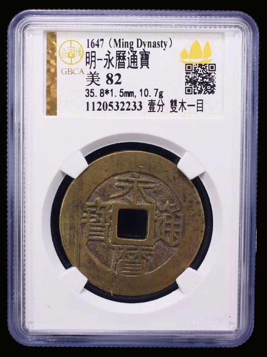 NAN MING: Yong Li, 1646-1659, AE 10 cash (10.7g), H-21.80, small flan, yi fen (one fen [of silver]) on reverse, graded 82 by GBCA Grading Company, VF.